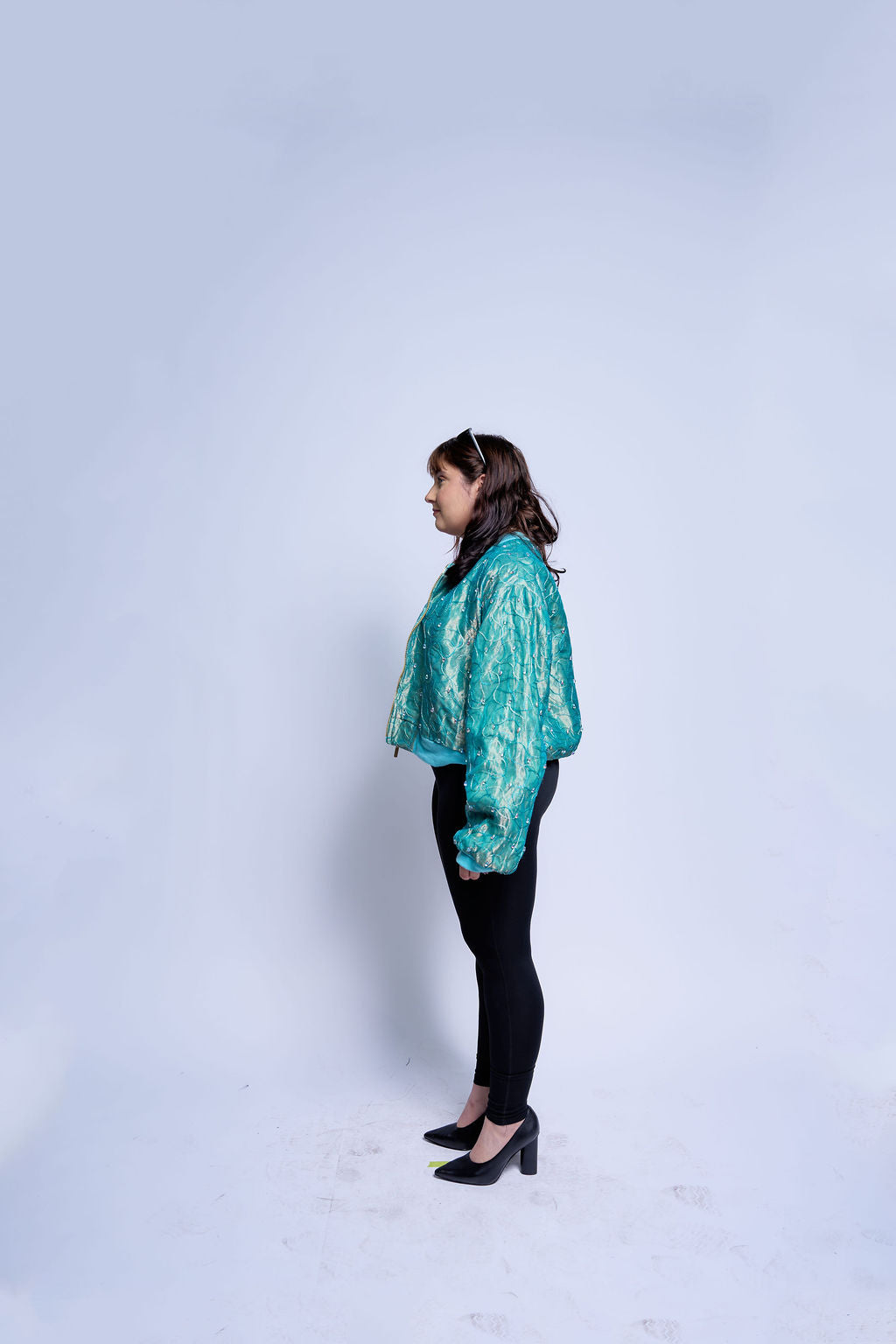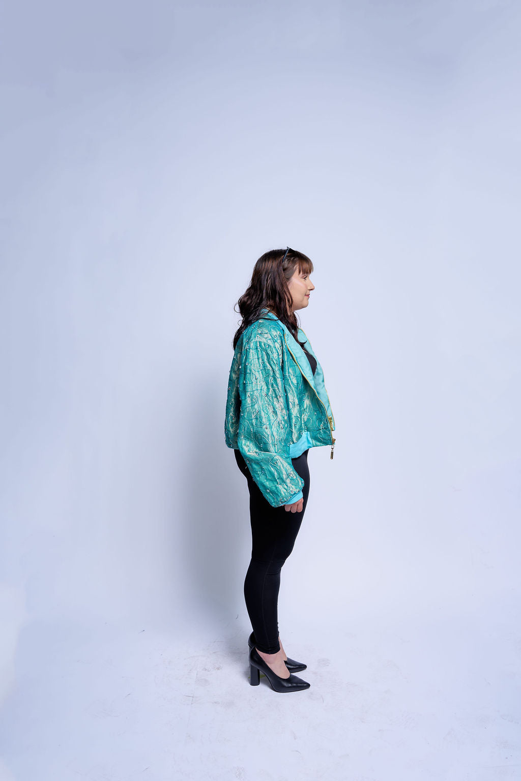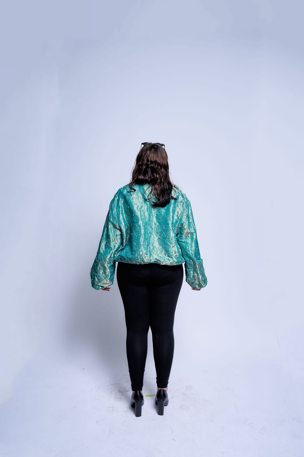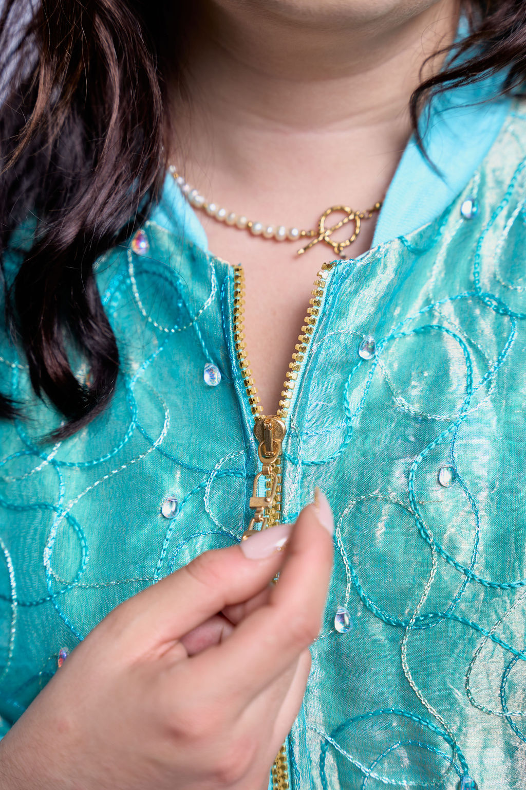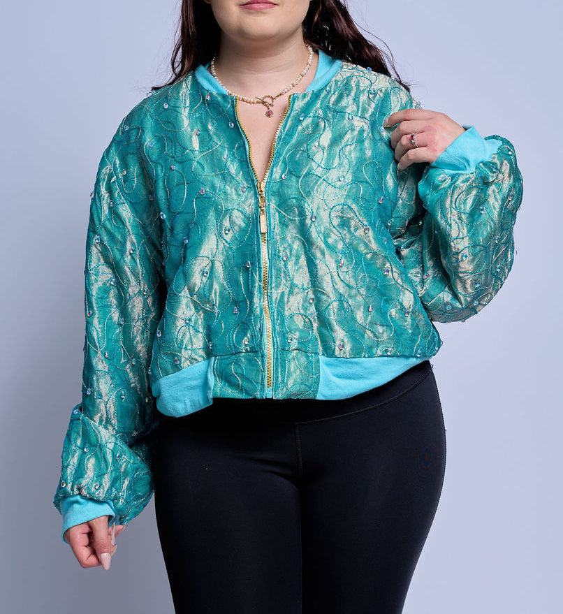 Cut from an iridescent jacquard that shifts between teal and seafoam, the shell catches light like moving water and never settles into a single tone.