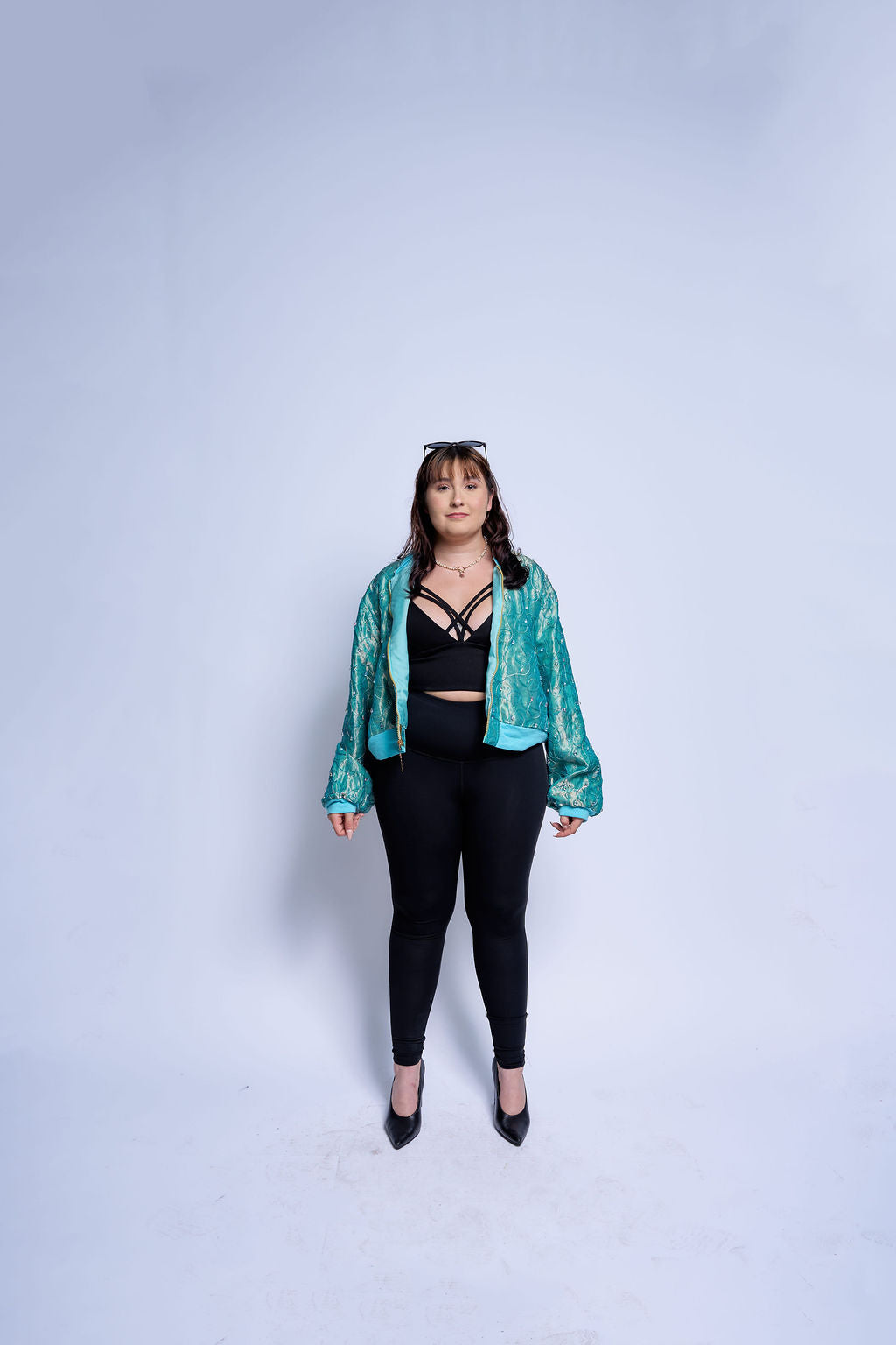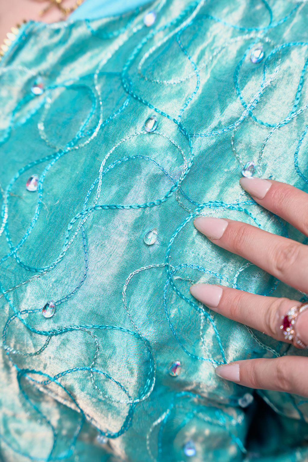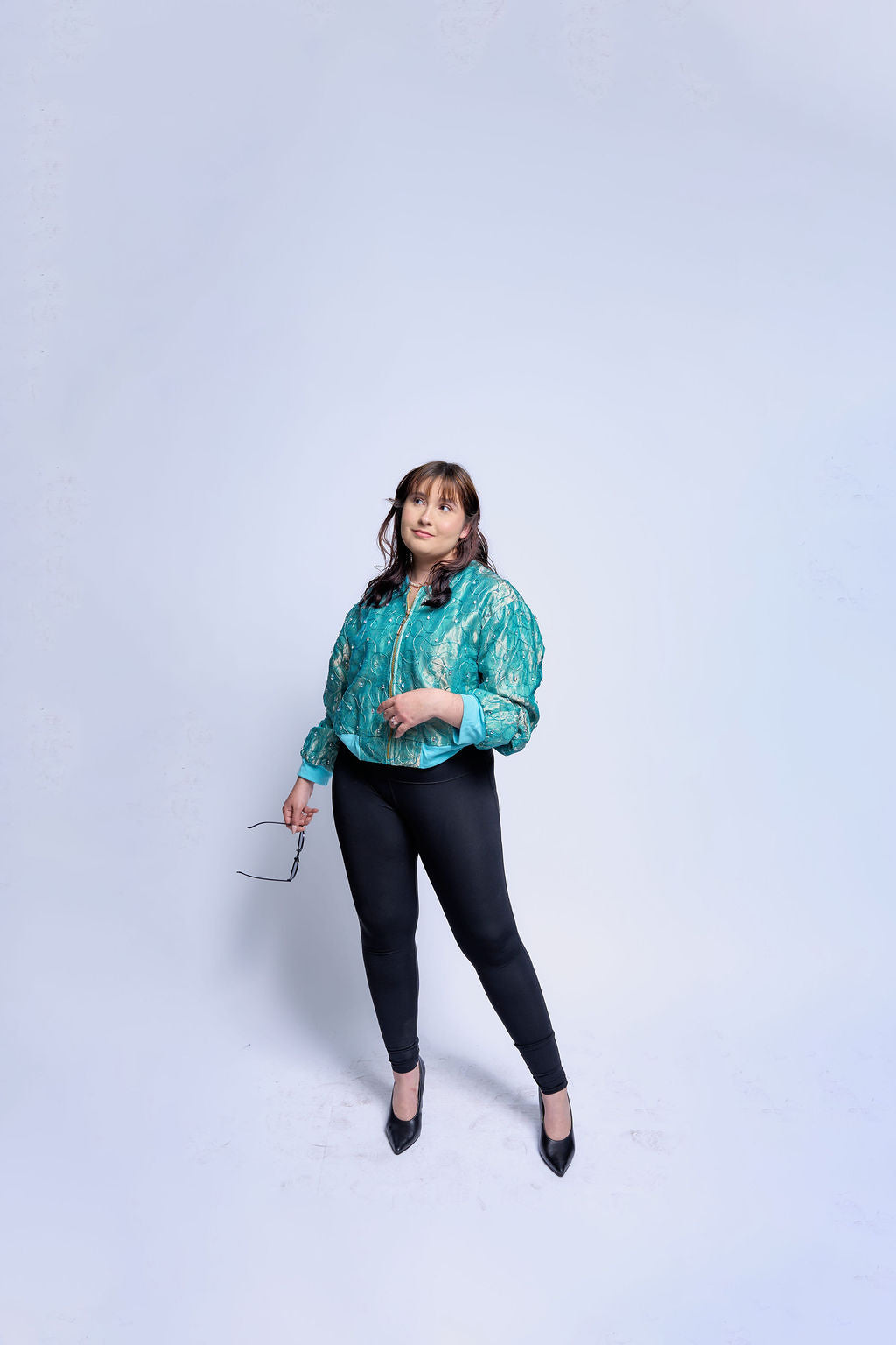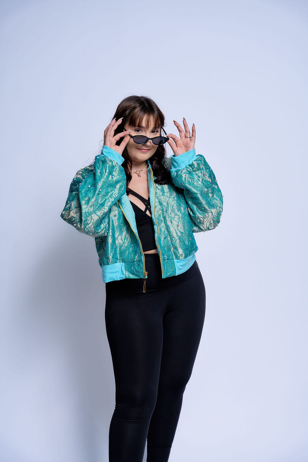 Cut from an iridescent jacquard that shifts between teal and seafoam, the shell catches light like moving water and never settles into a single tone.