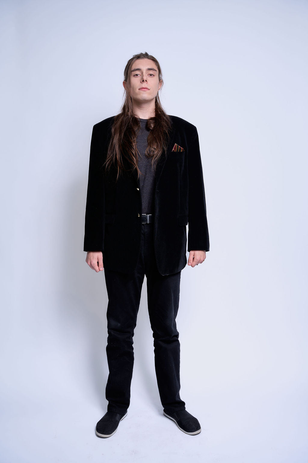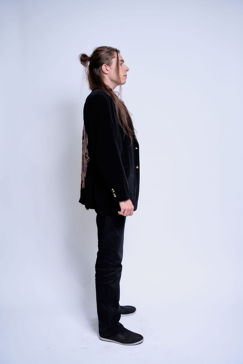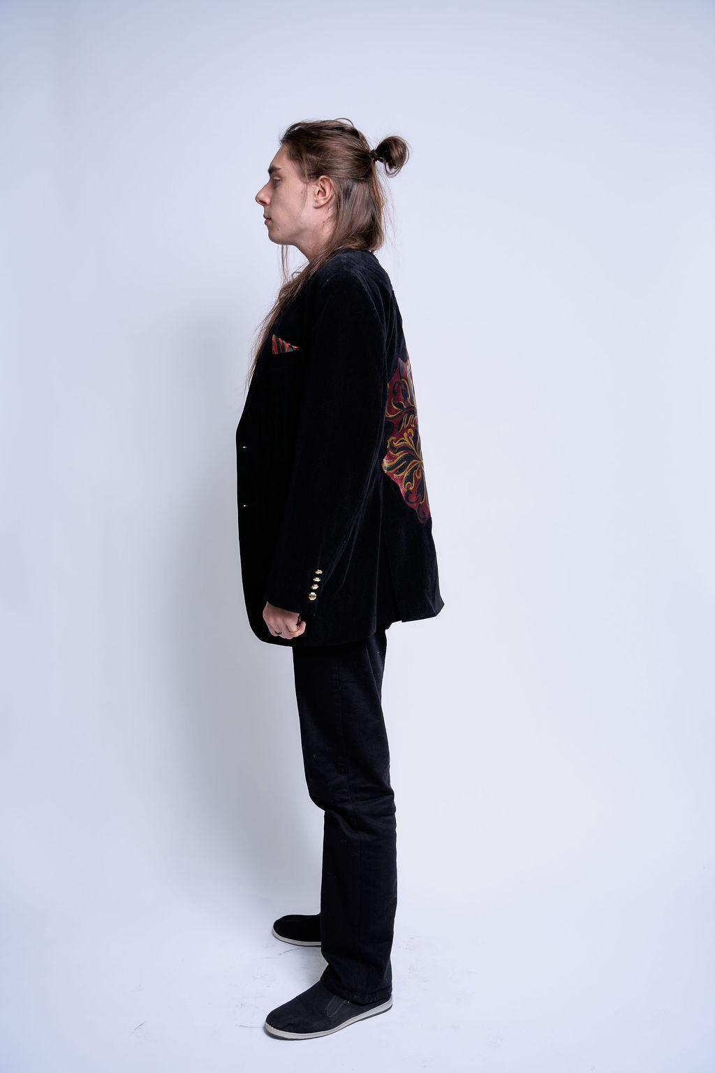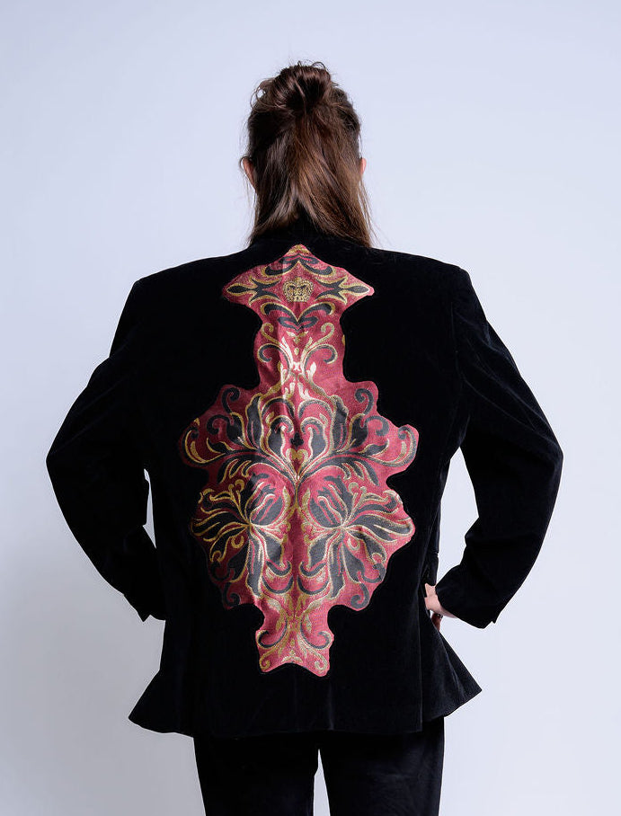 The Aries jacket deploys contrast as its defining structure: a matte black corduroy base complemented by a burnished red and gold applique. This bold textile acts as the garment’s focal architecture, infusing heat and scale into its silhouette.