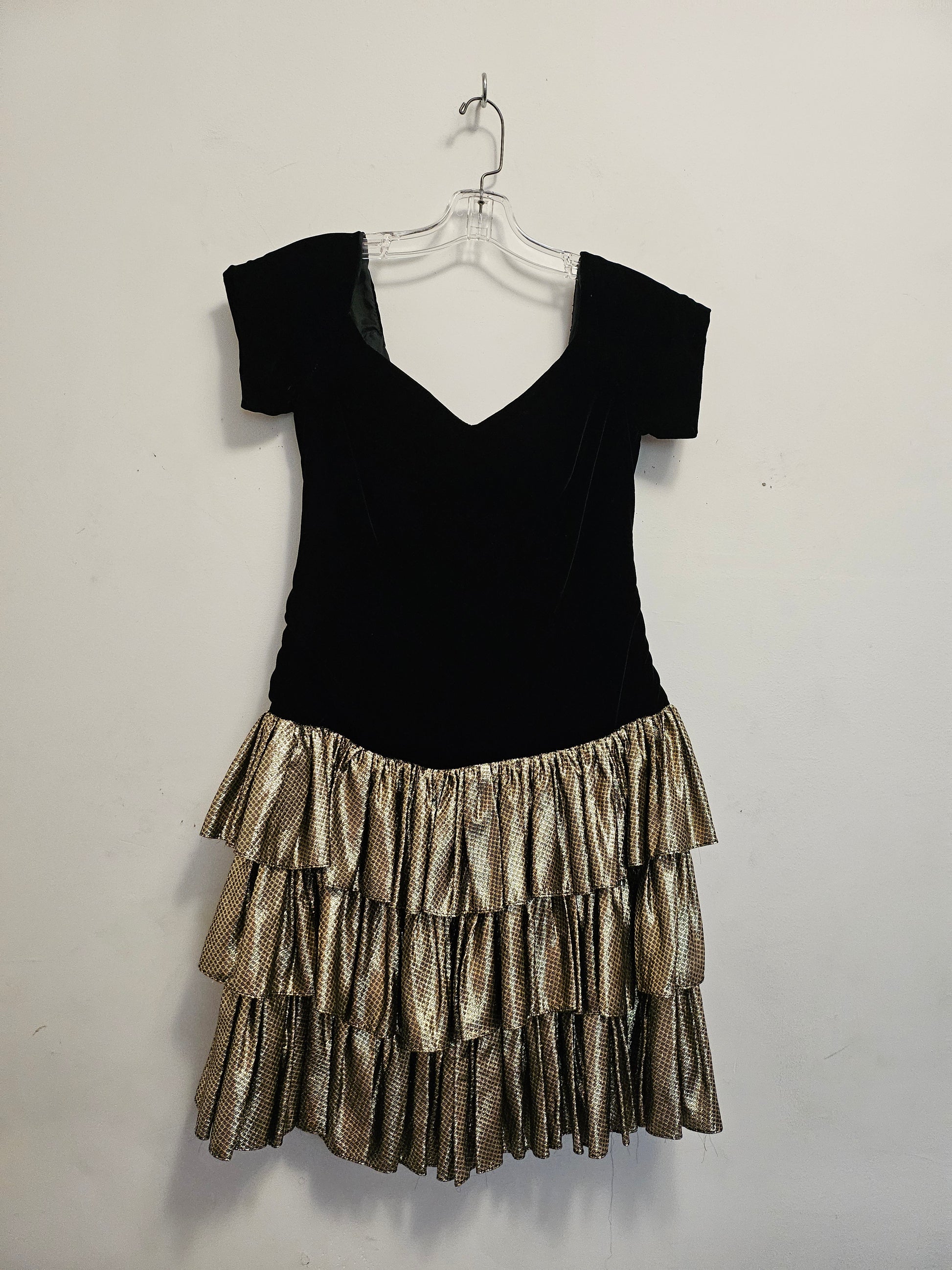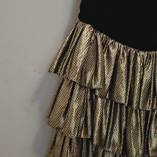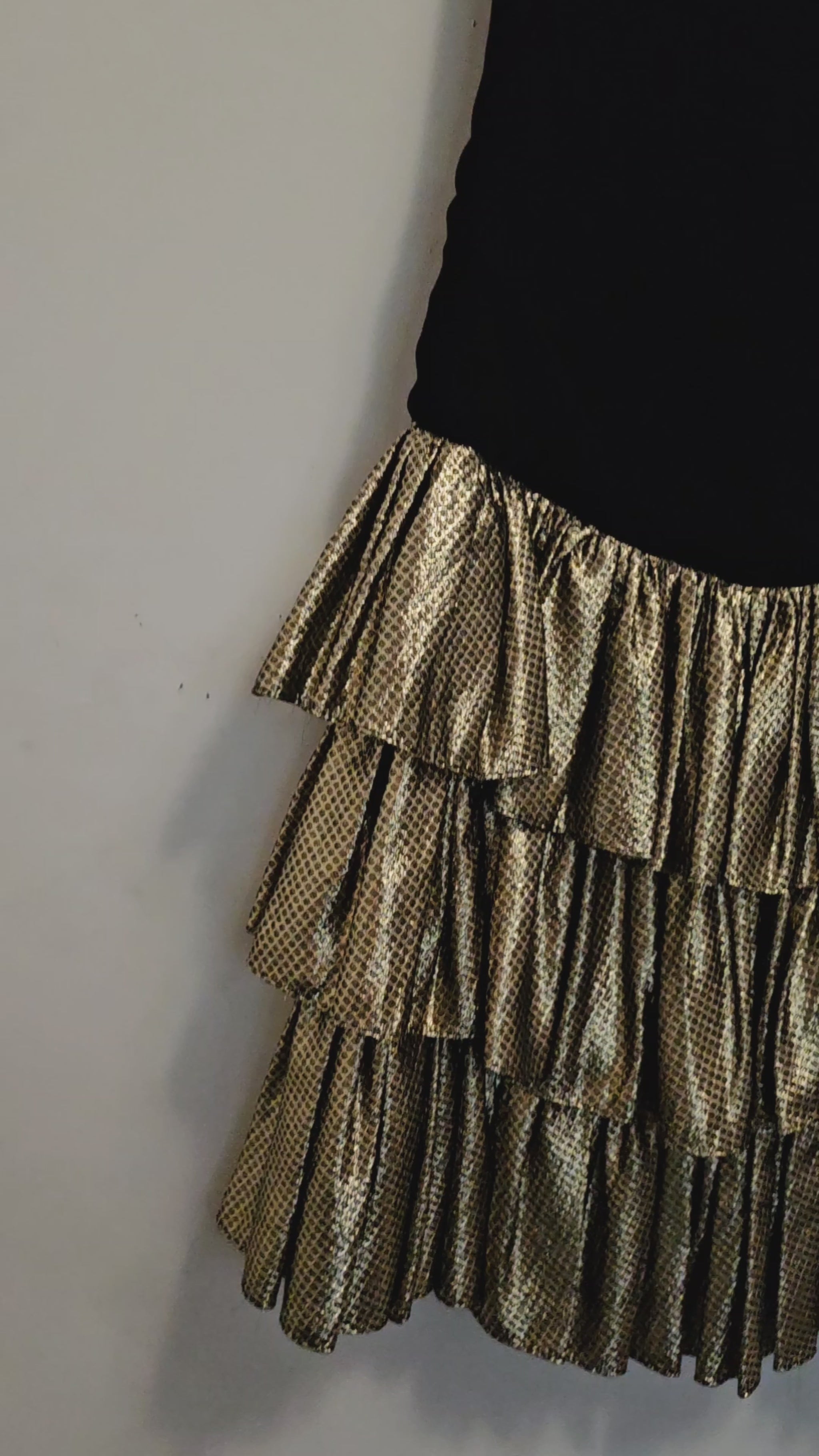 - Vintage 80s off-shoulder velvet sweetheart neckline black dress with gold ruffles skirt and adorned with matching bows.