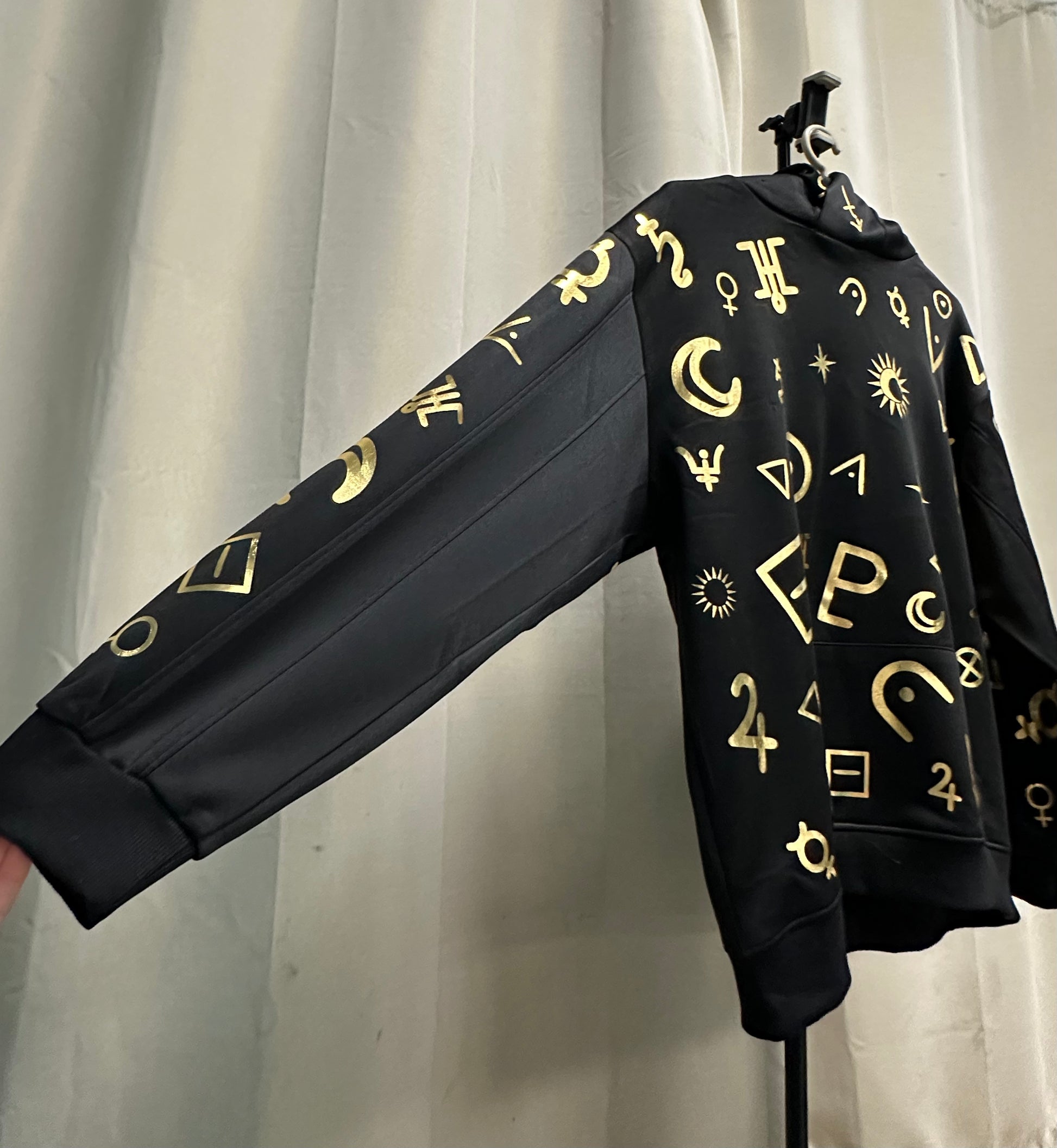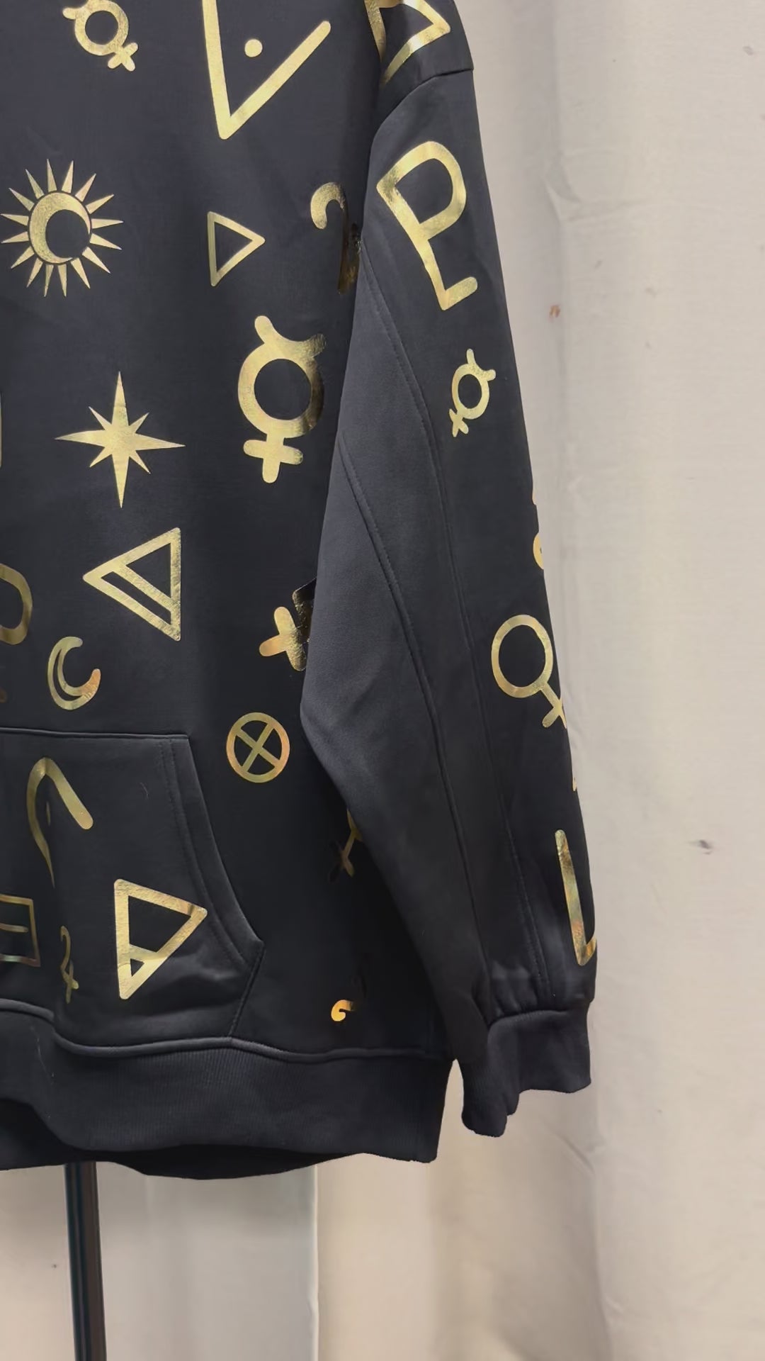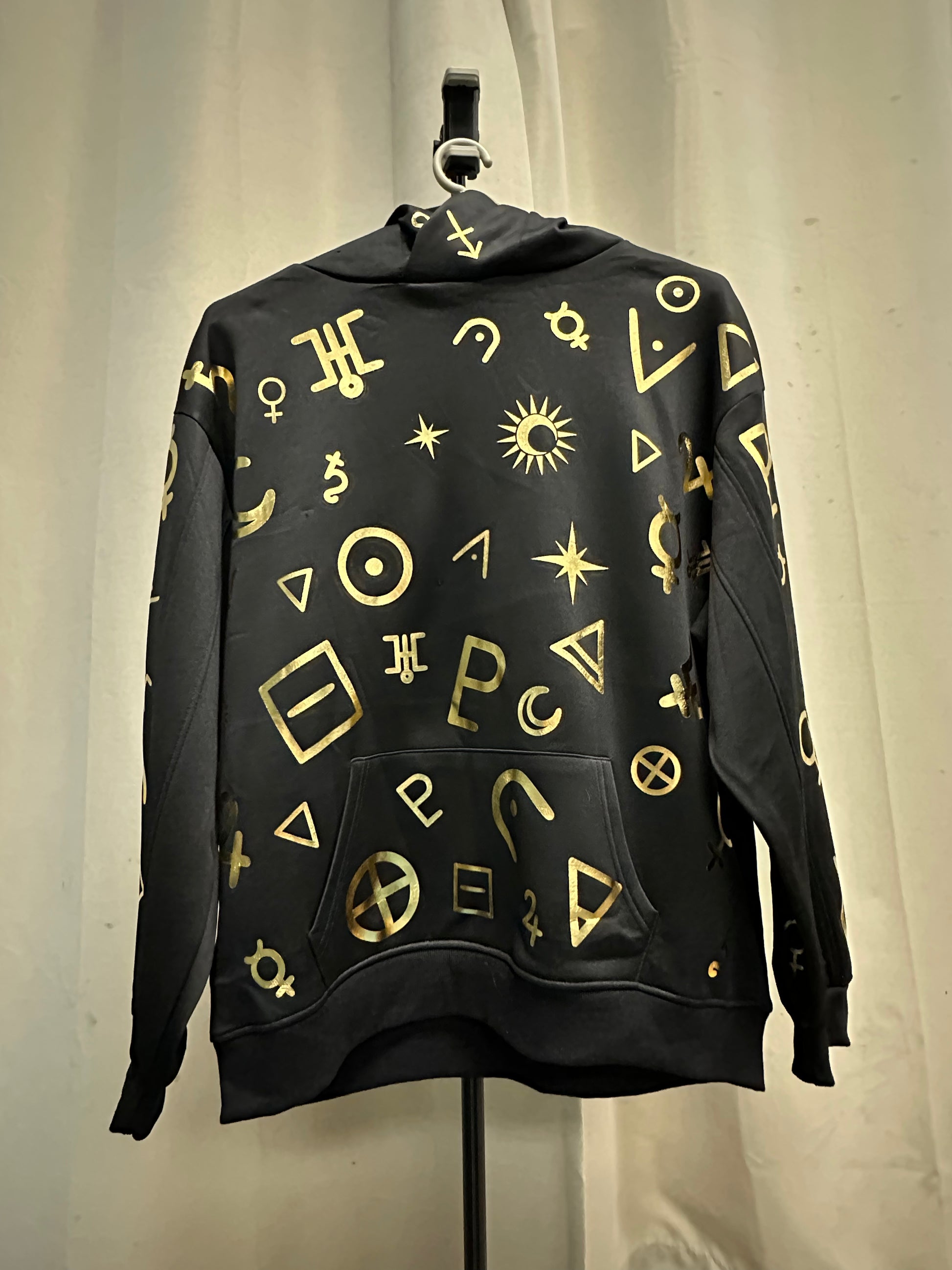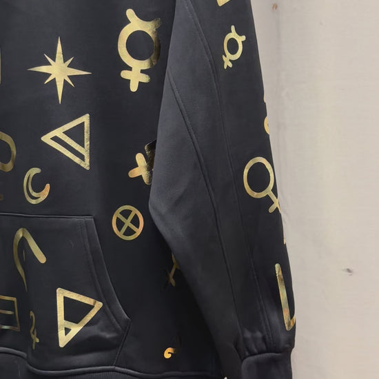Covered in metallic gold astrological, alchemical, and planetary symbols, Charted turns the hoodie into a wearable star chart: an ode to identity, timing, and the unseen forces that shape us.