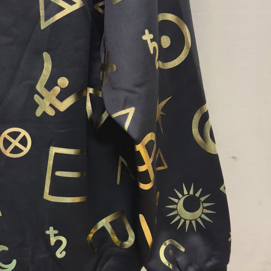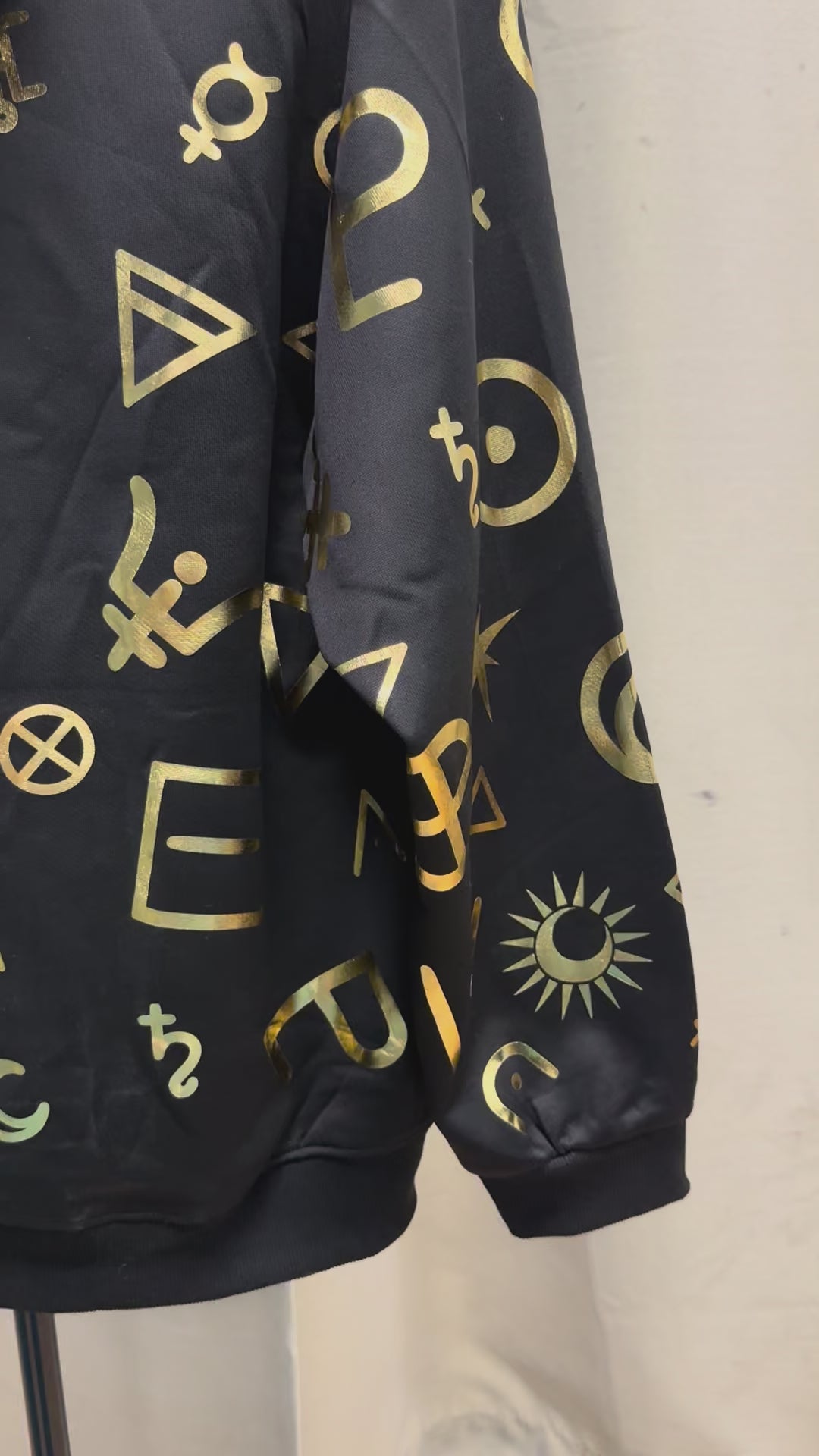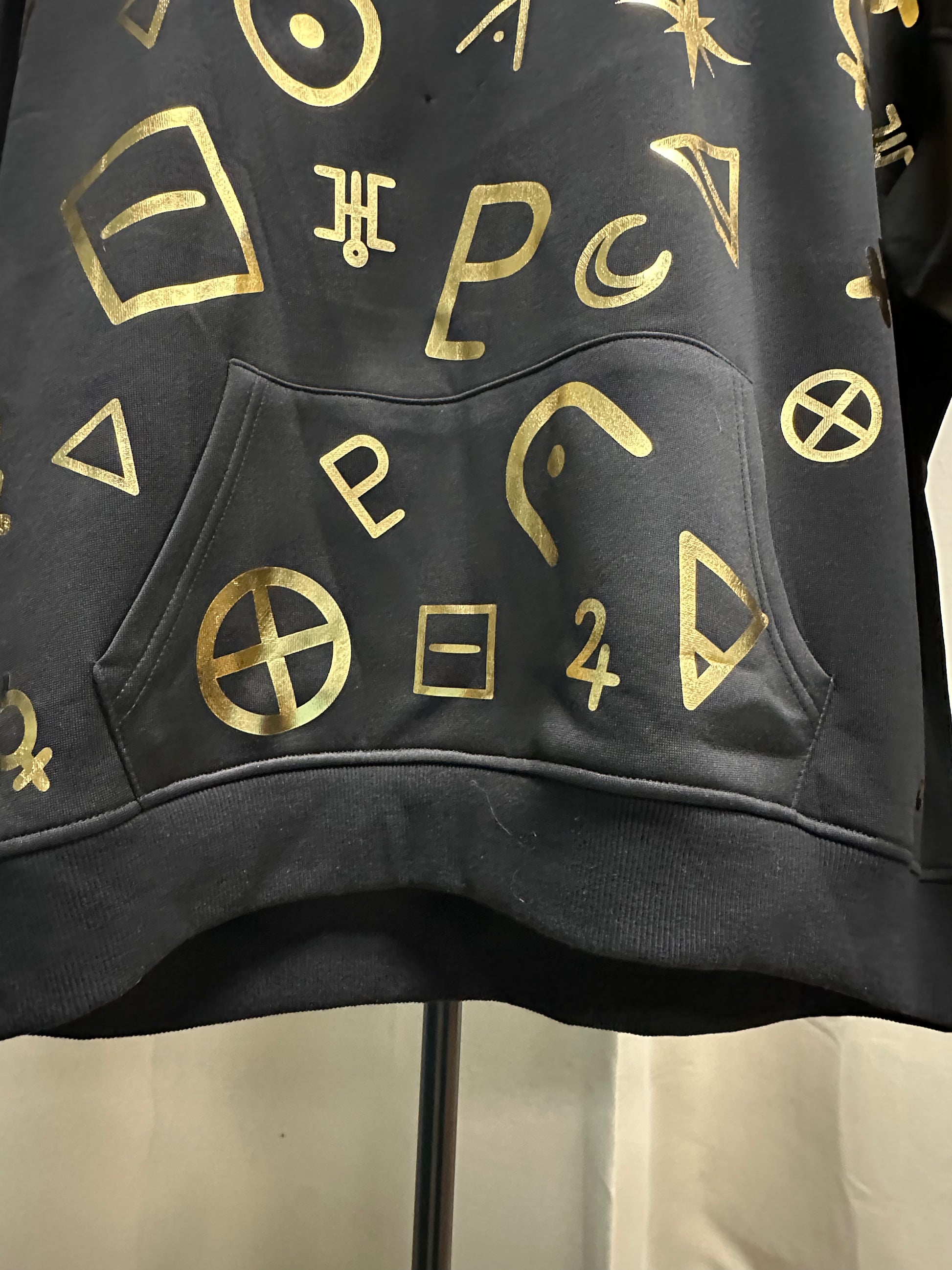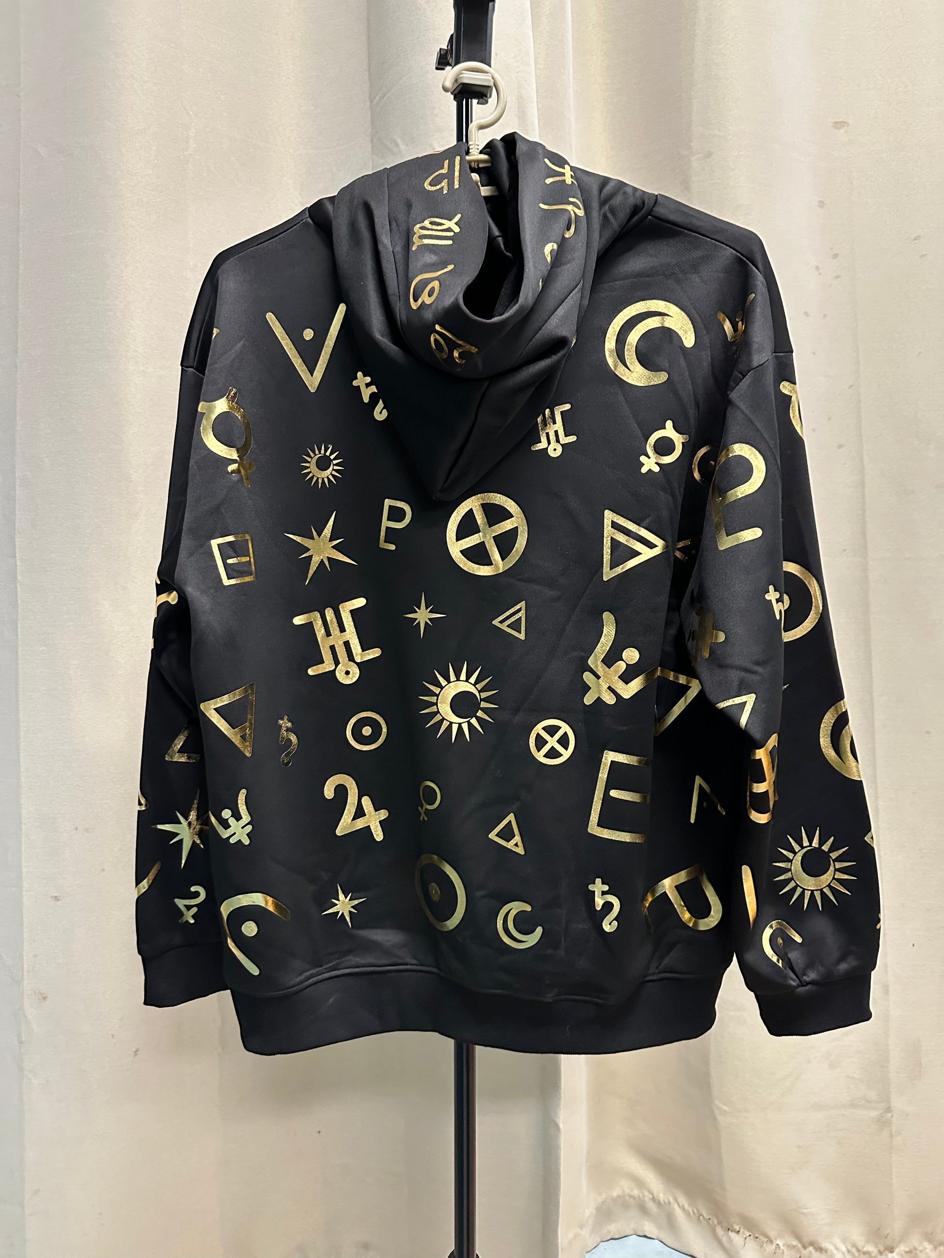 Covered in metallic gold astrological, alchemical, and planetary symbols, Charted turns the hoodie into a wearable star chart: an ode to identity, timing, and the unseen forces that shape us.
