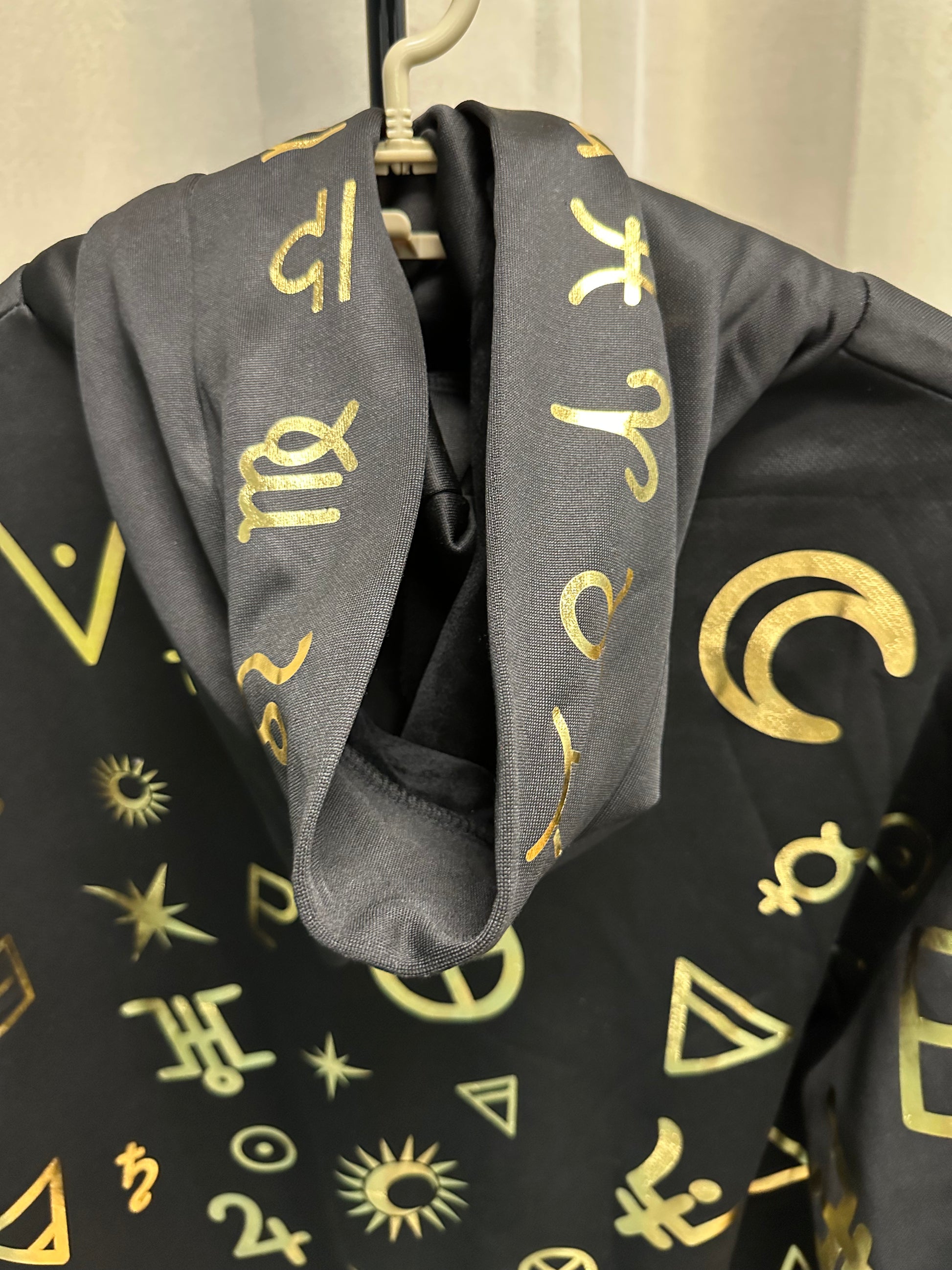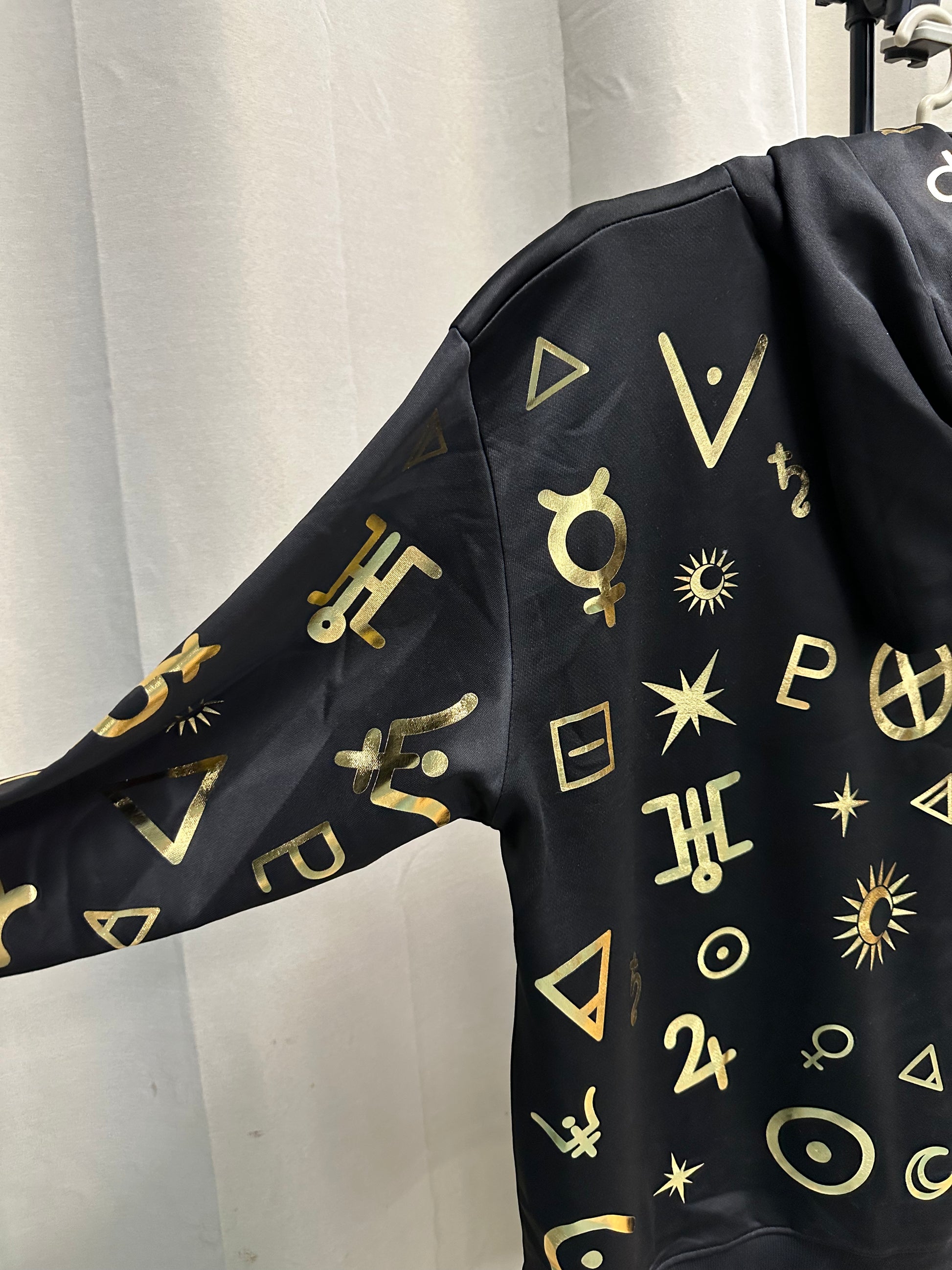 Each symbol is individually heat-transferred in reflective gold foil, creating a striking contrast against the matte-black base. The hood is fully wrapped in zodiac glyphs, while the sleeves and body are densely patterned to resemble a celestial diagram.