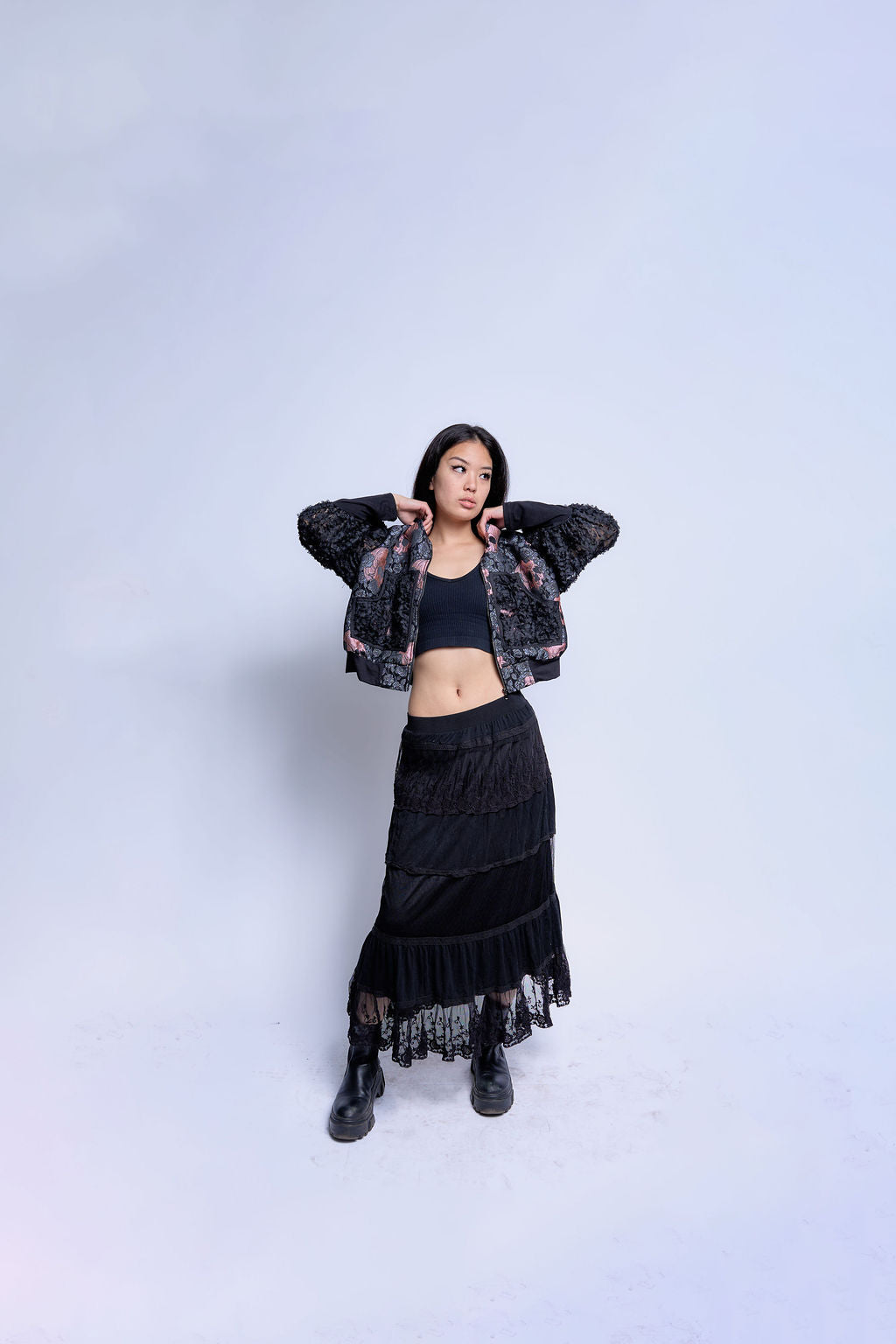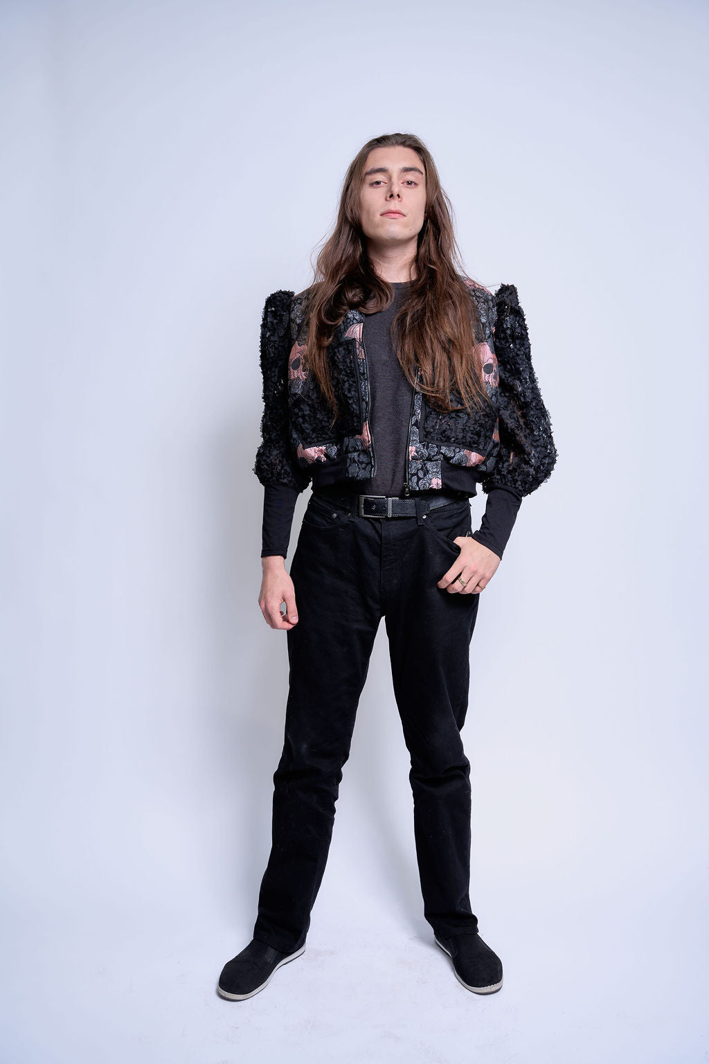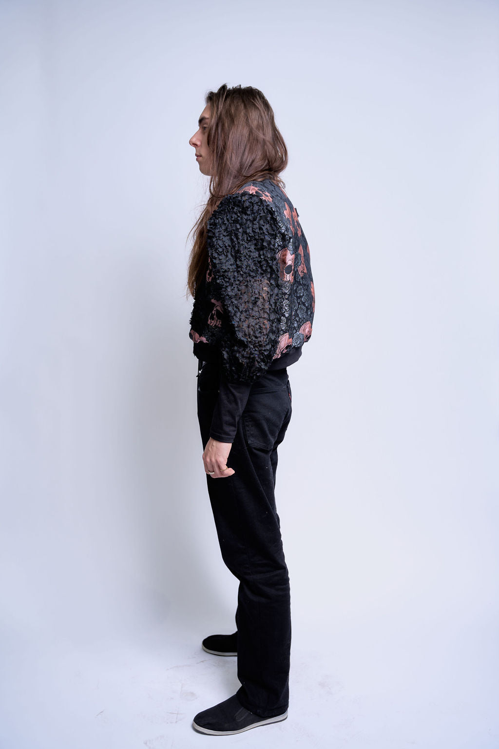 Pockets lined in the same rosette textile reinforce material continuity across zones. A center zipper keeps the silhouette grounded in bomber proportion.