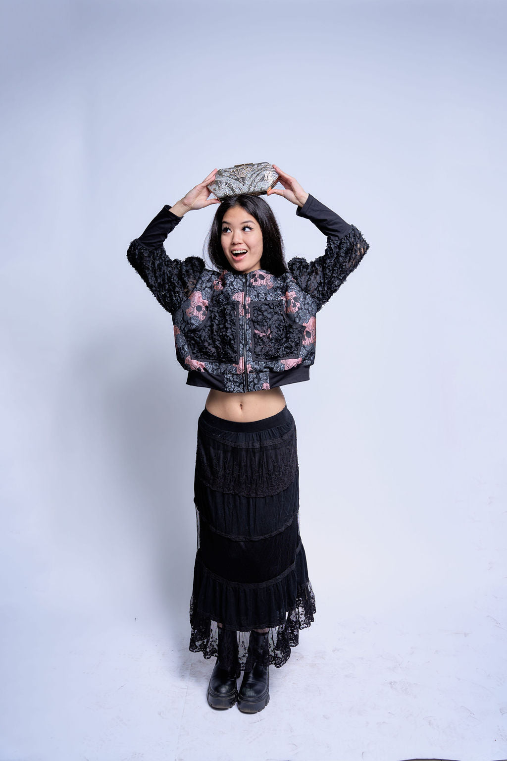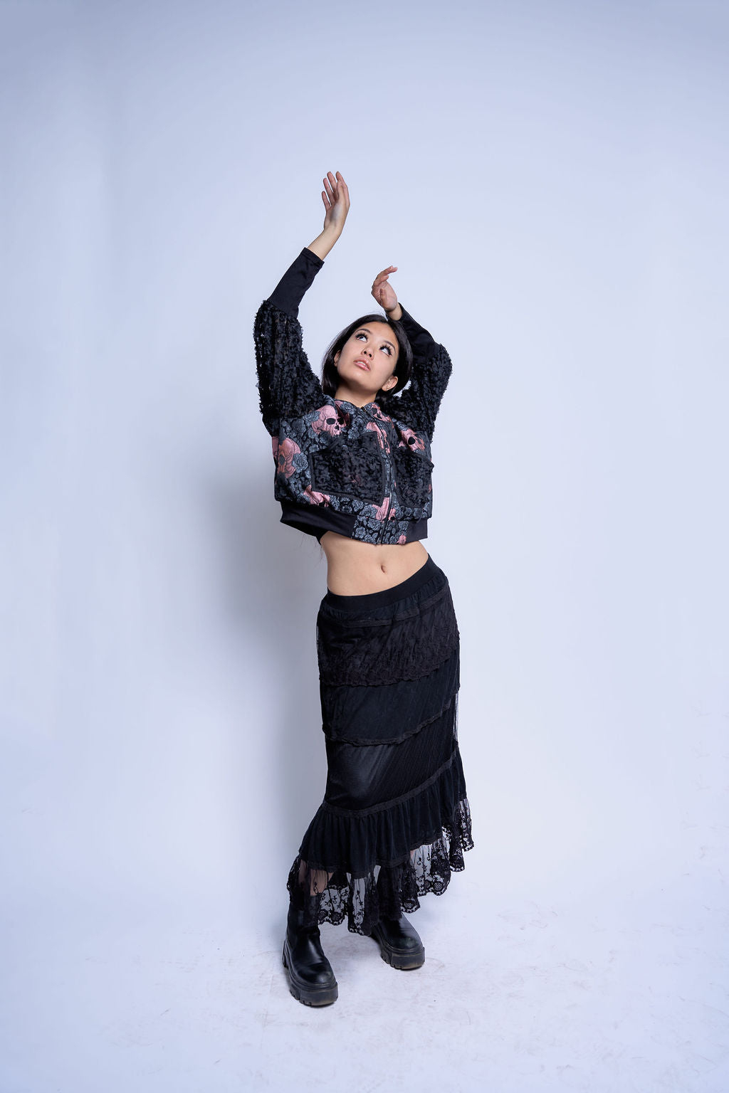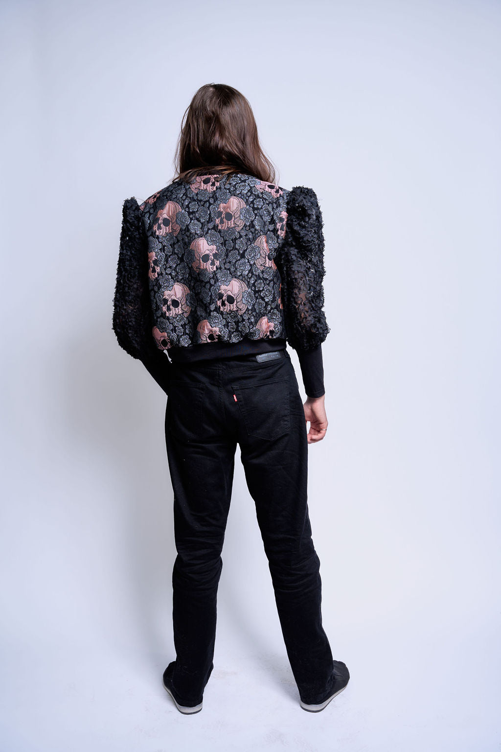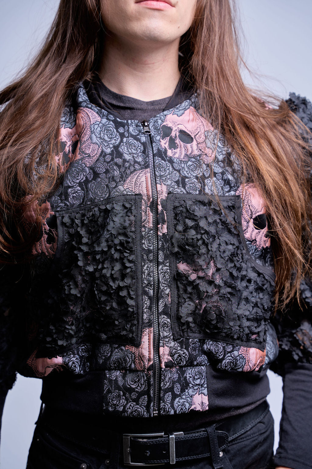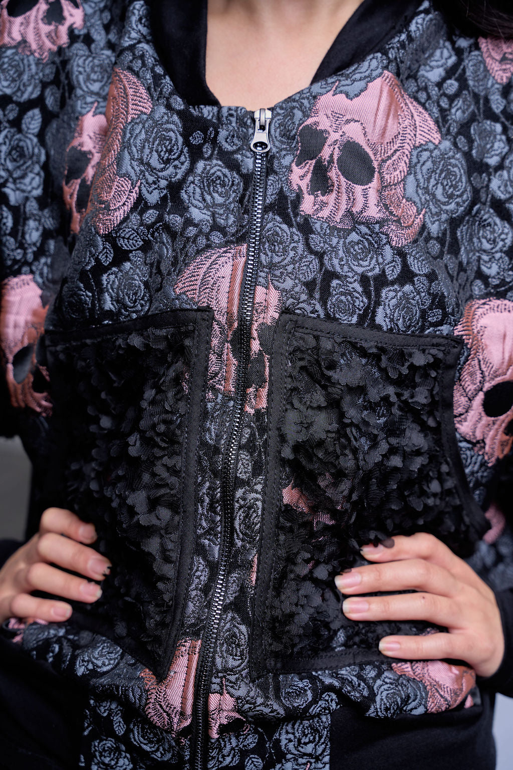 A pink skull + rose jacquard forms the body, its woven detail gives depth without relying on print, creating a dense narrative field against black ground.