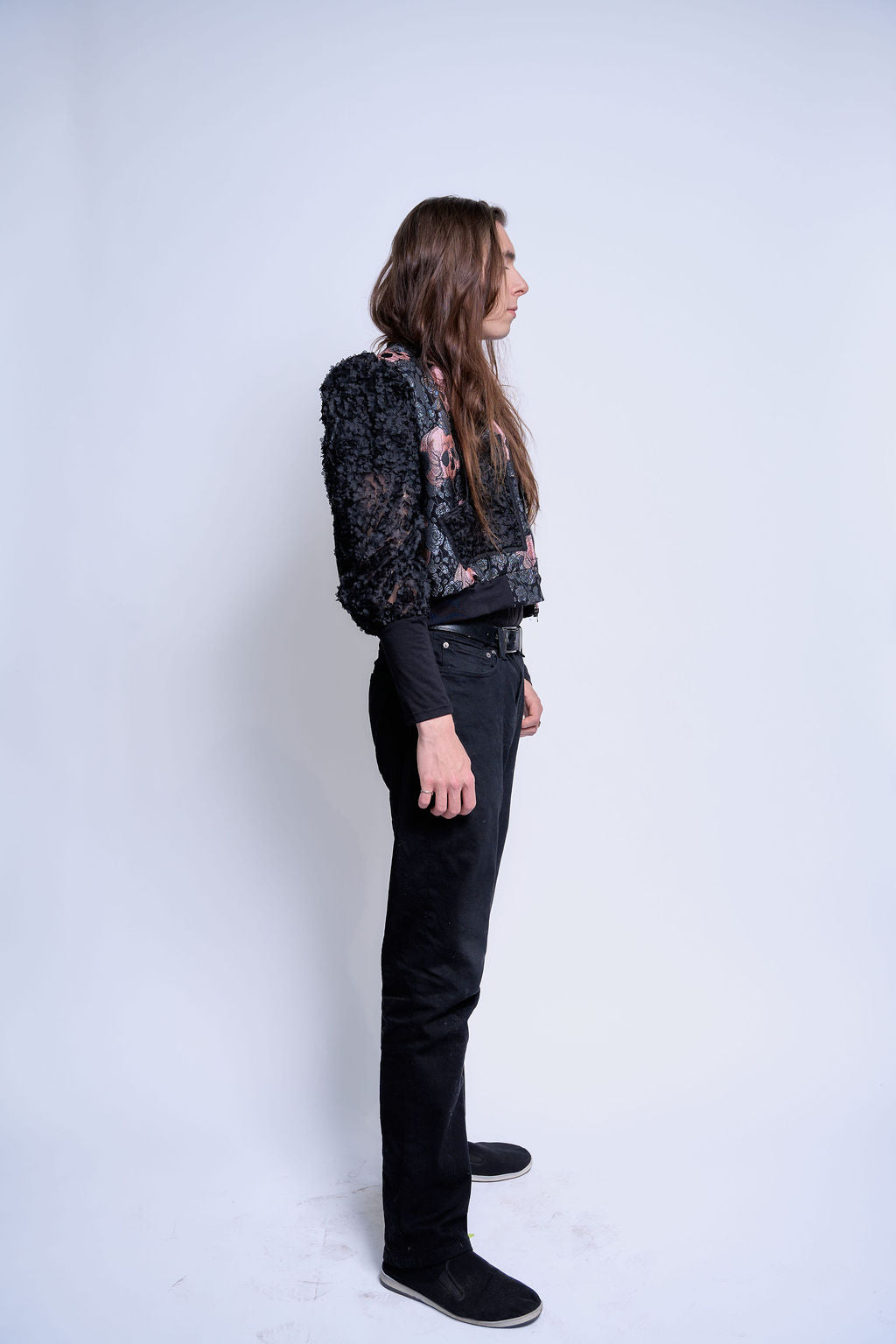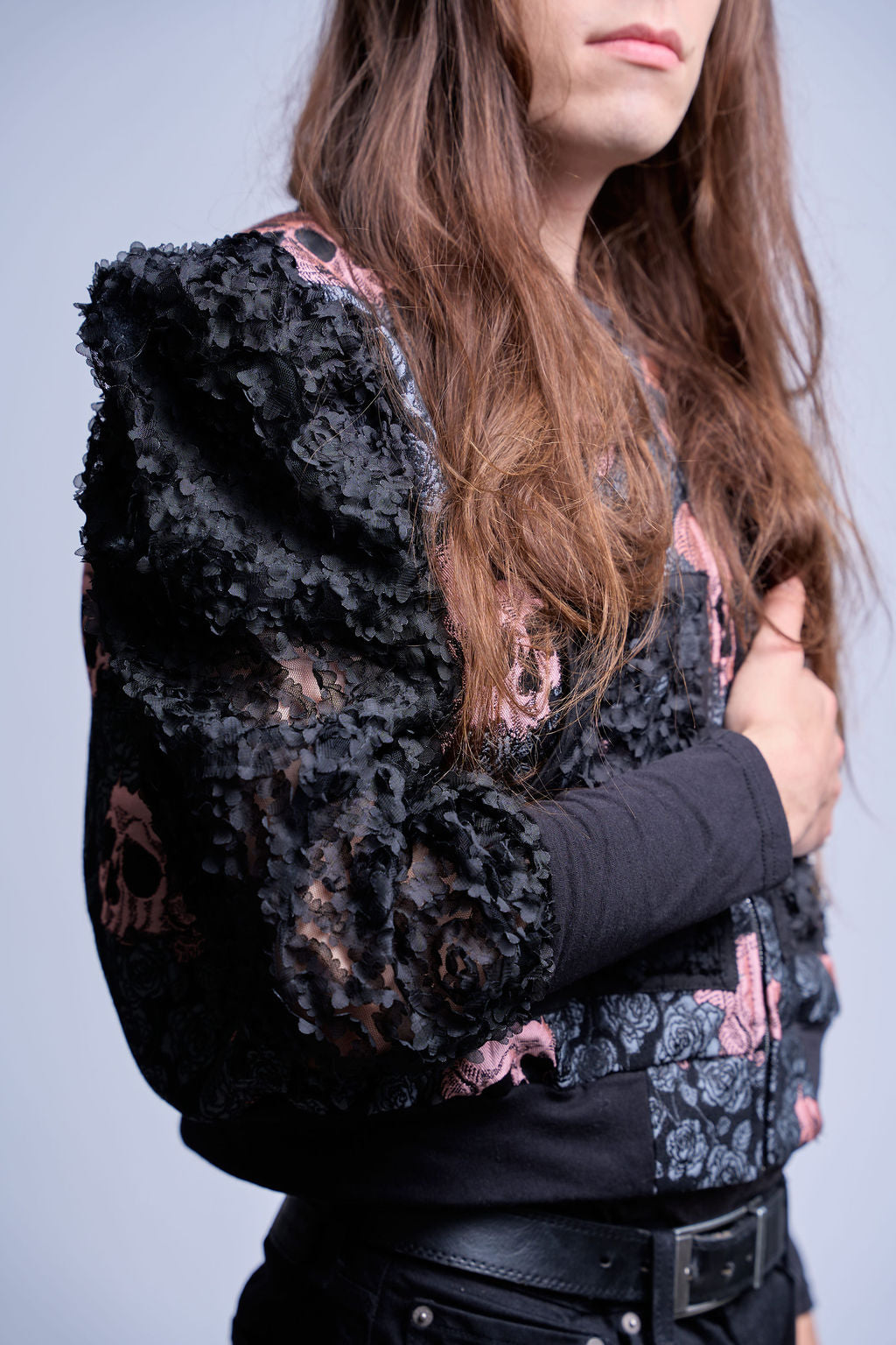 The sleeves shift into full 3D rosette appliqué, producing sculptural volume and matte shadow that reads like matter dissolving and reforming in real time.