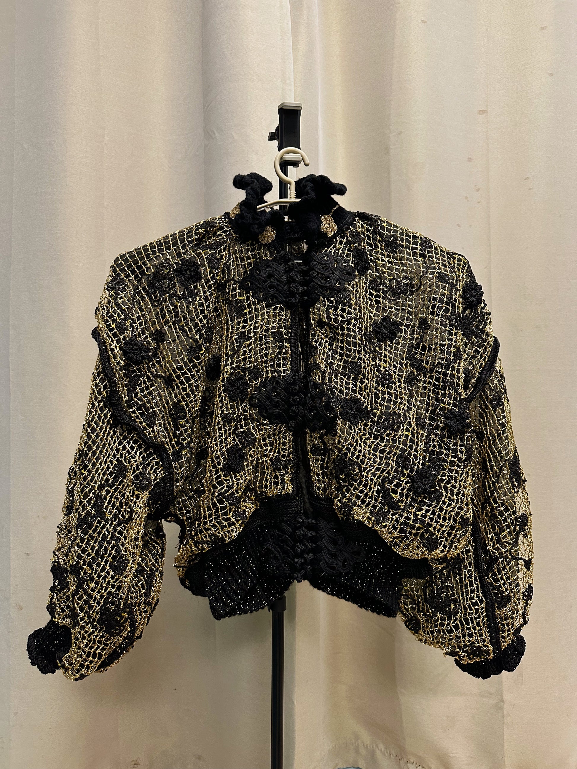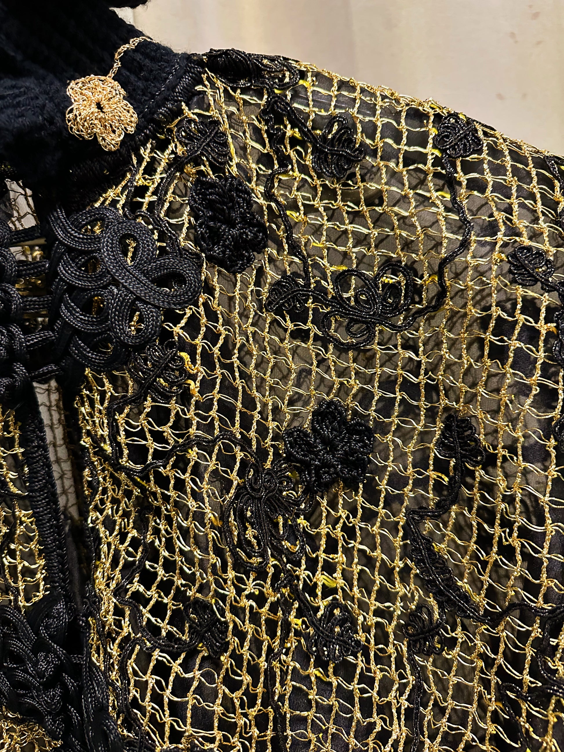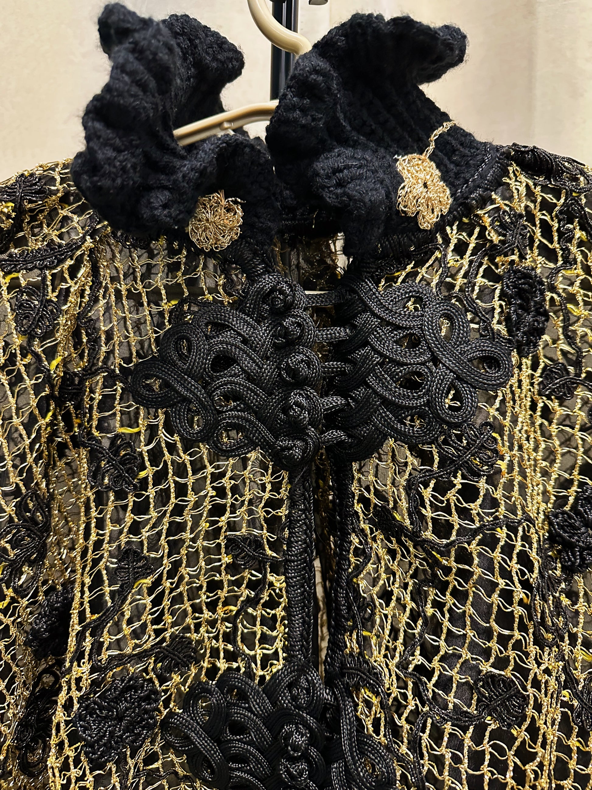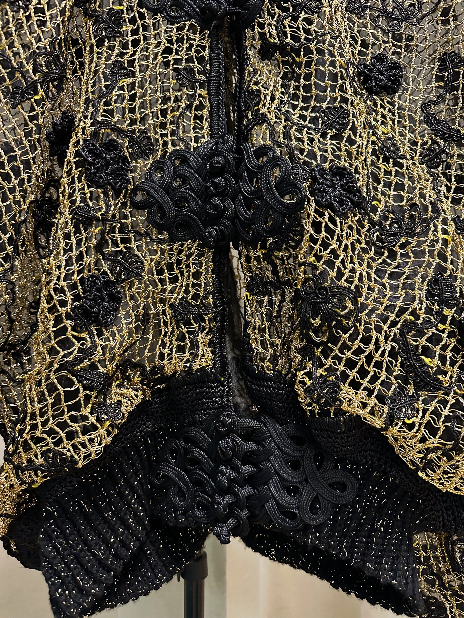 Outer shell consists of hand-crocheted gold netting, adorned by black floral motifs that sweep across the latticework.