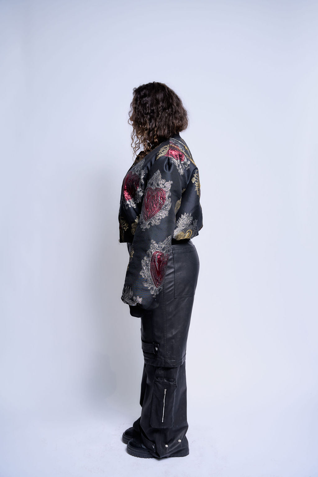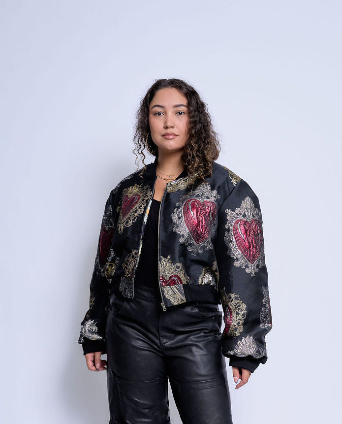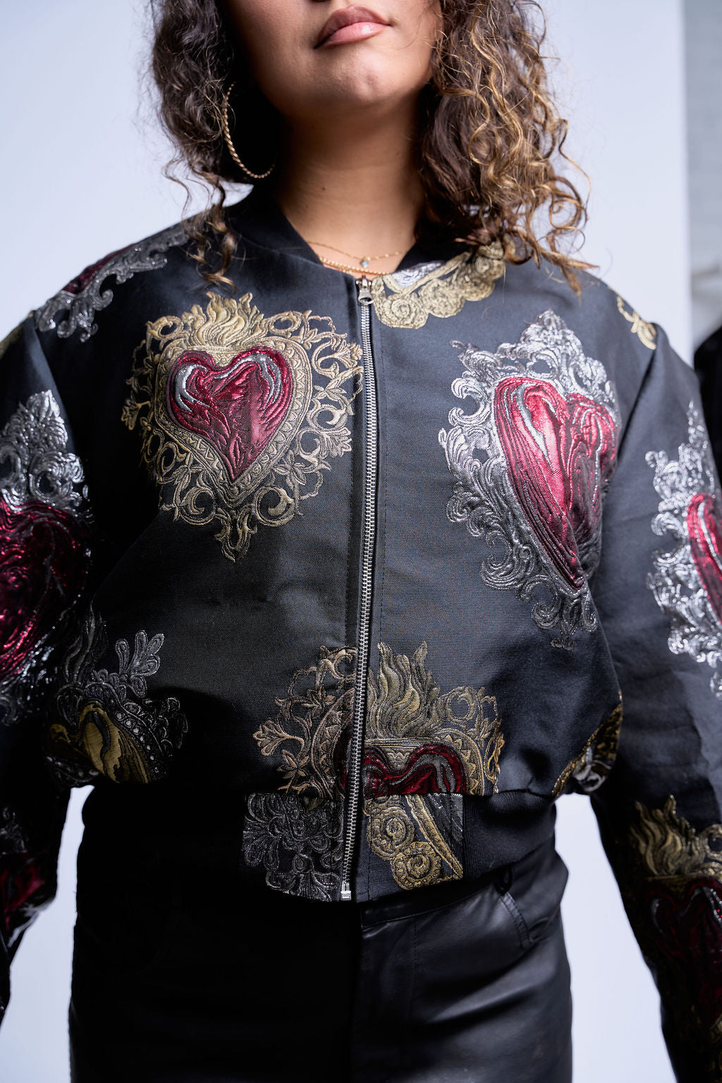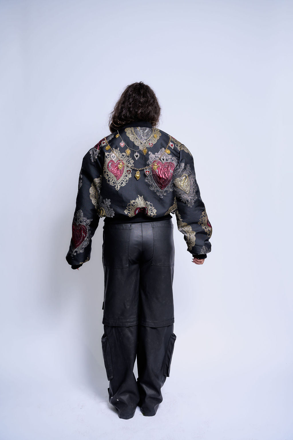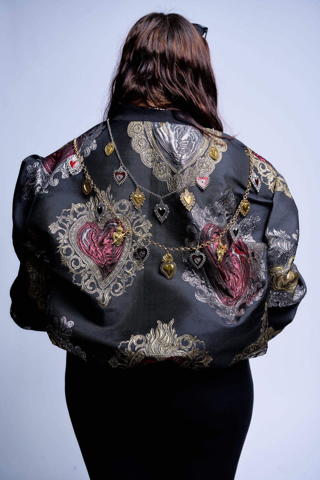 Designed from an opulent metallic brocade, The Lovers Jacket redefines statement outerwear. The embroidered sacred hearts across the body and sleeves create a rich visual tapestry, contrasted with a structured bomber fit that feels both modern and timeless. On the back, a hand-placed arrangement of gold and silver charms drapes elegantly across the shoulders, adding movement and depth.