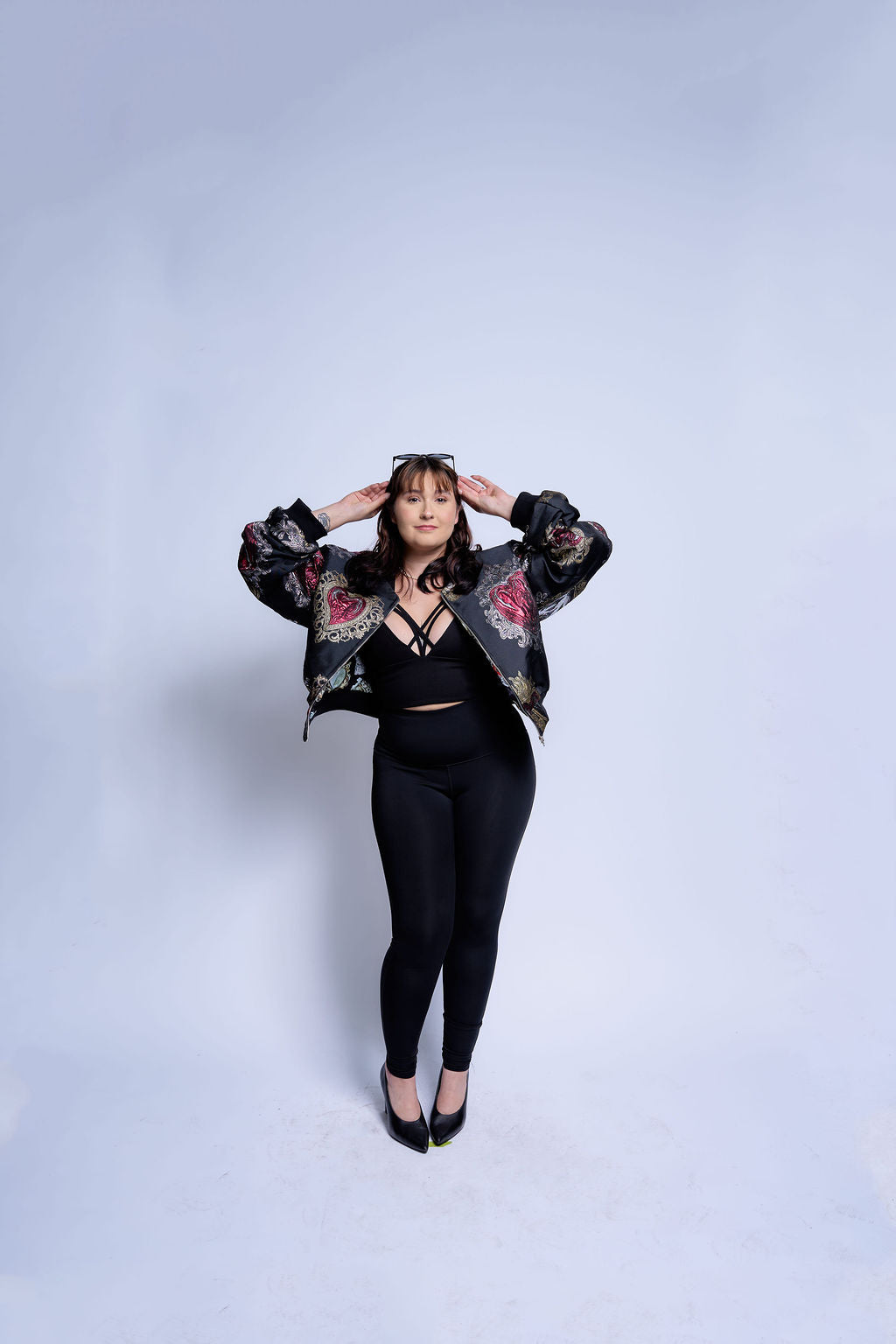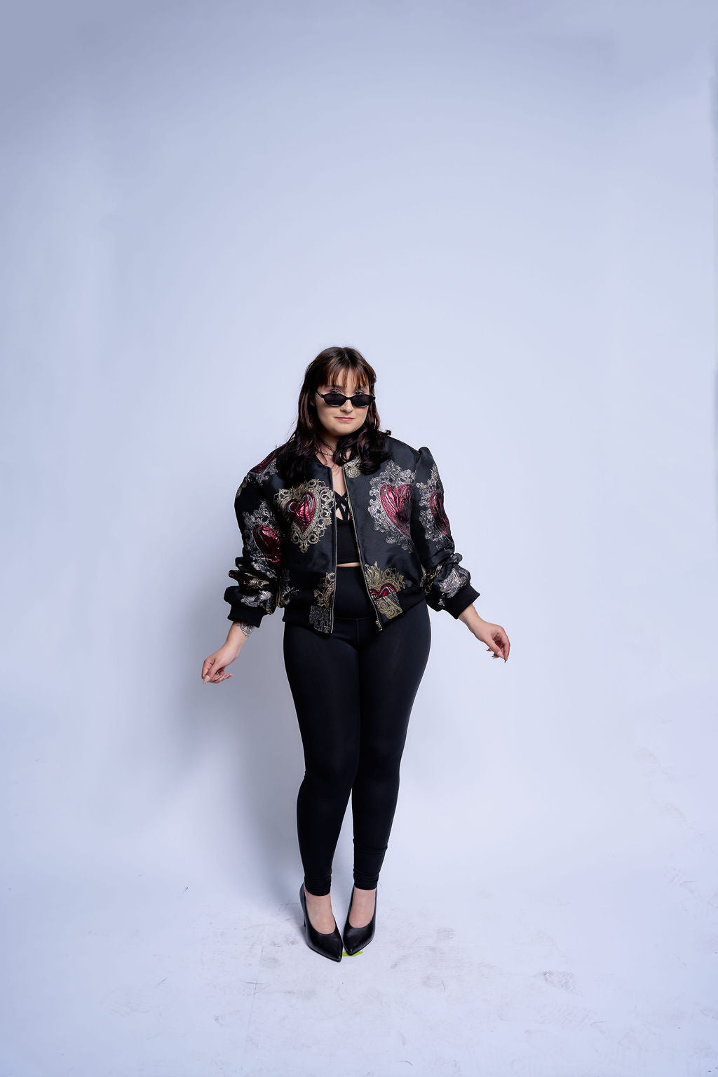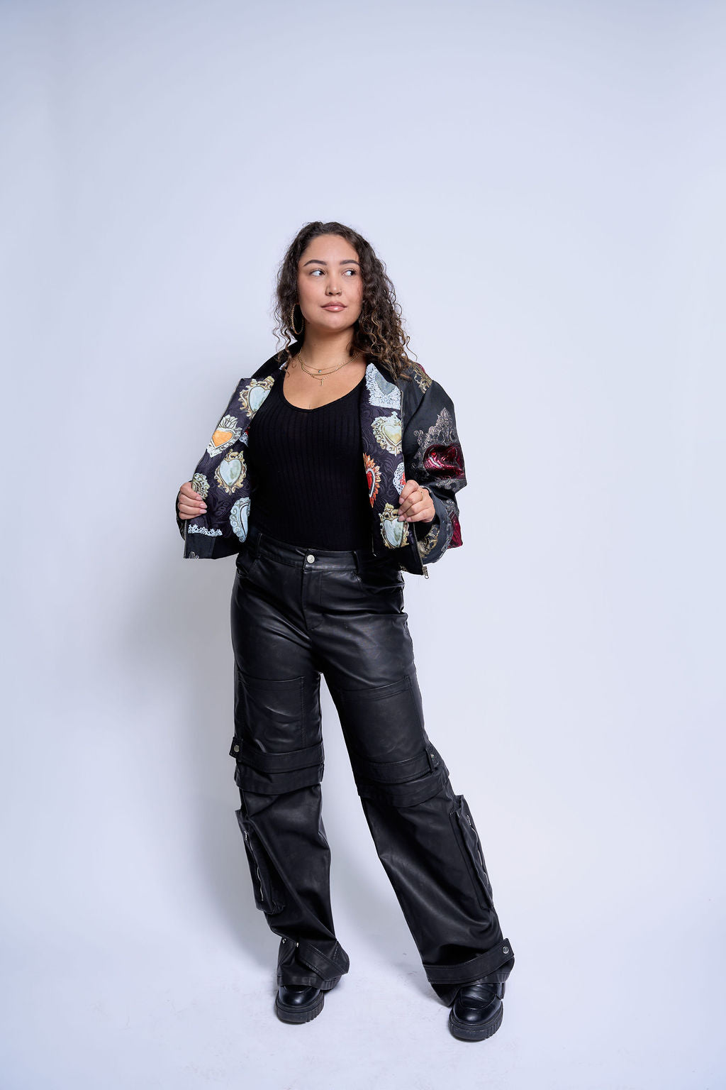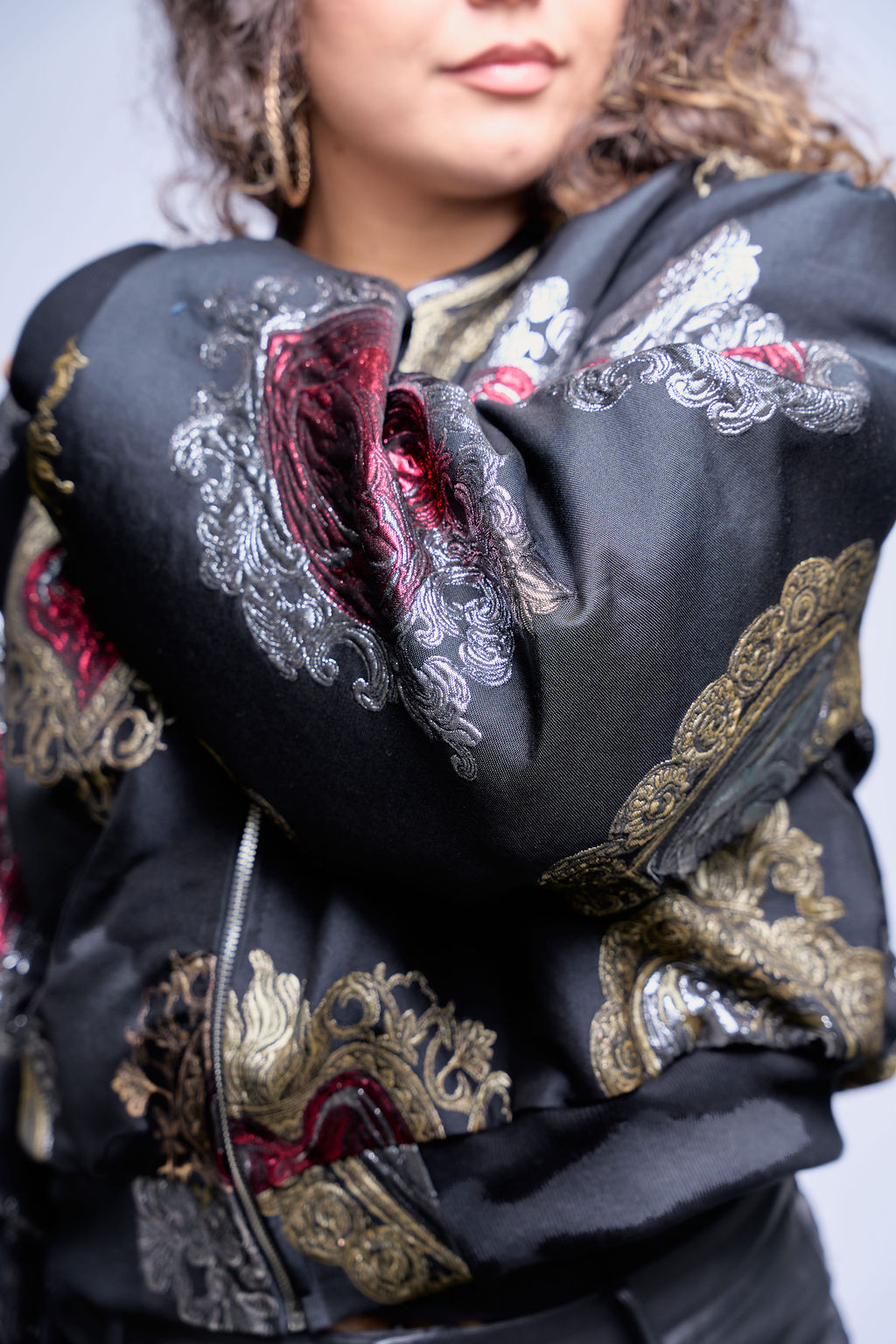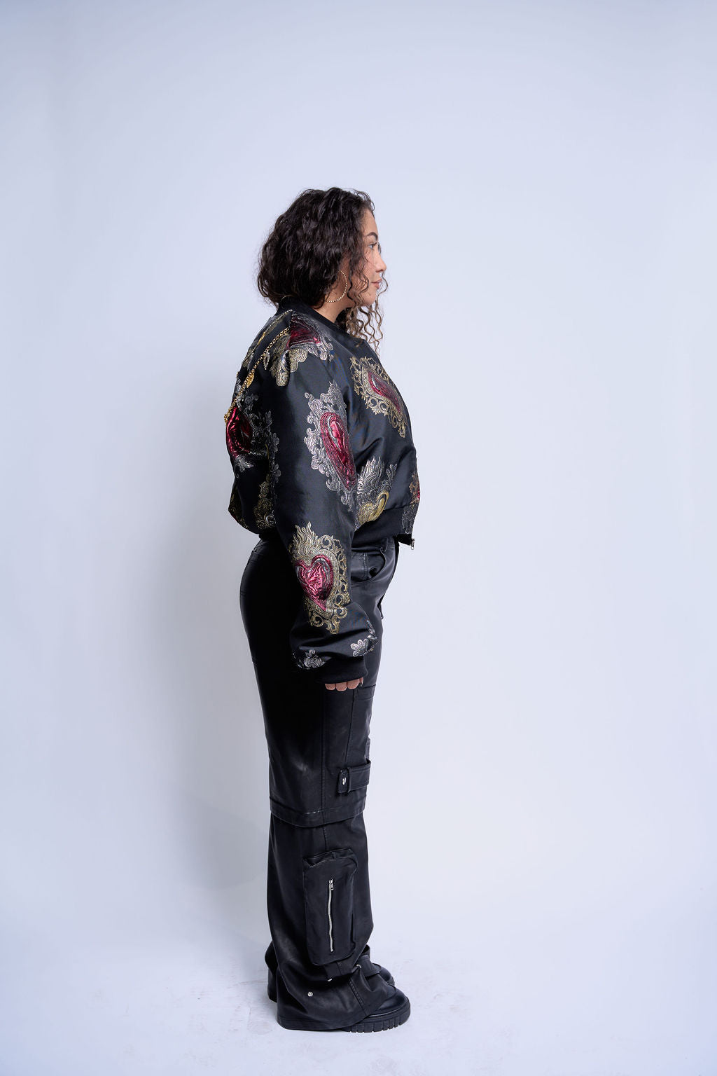 Designed from an opulent metallic brocade, The Lovers Jacket redefines statement outerwear. The embroidered sacred hearts across the body and sleeves create a rich visual tapestry, contrasted with a structured bomber fit that feels both modern and timeless. On the back, a hand-placed arrangement of gold and silver charms drapes elegantly across the shoulders, adding movement and depth.