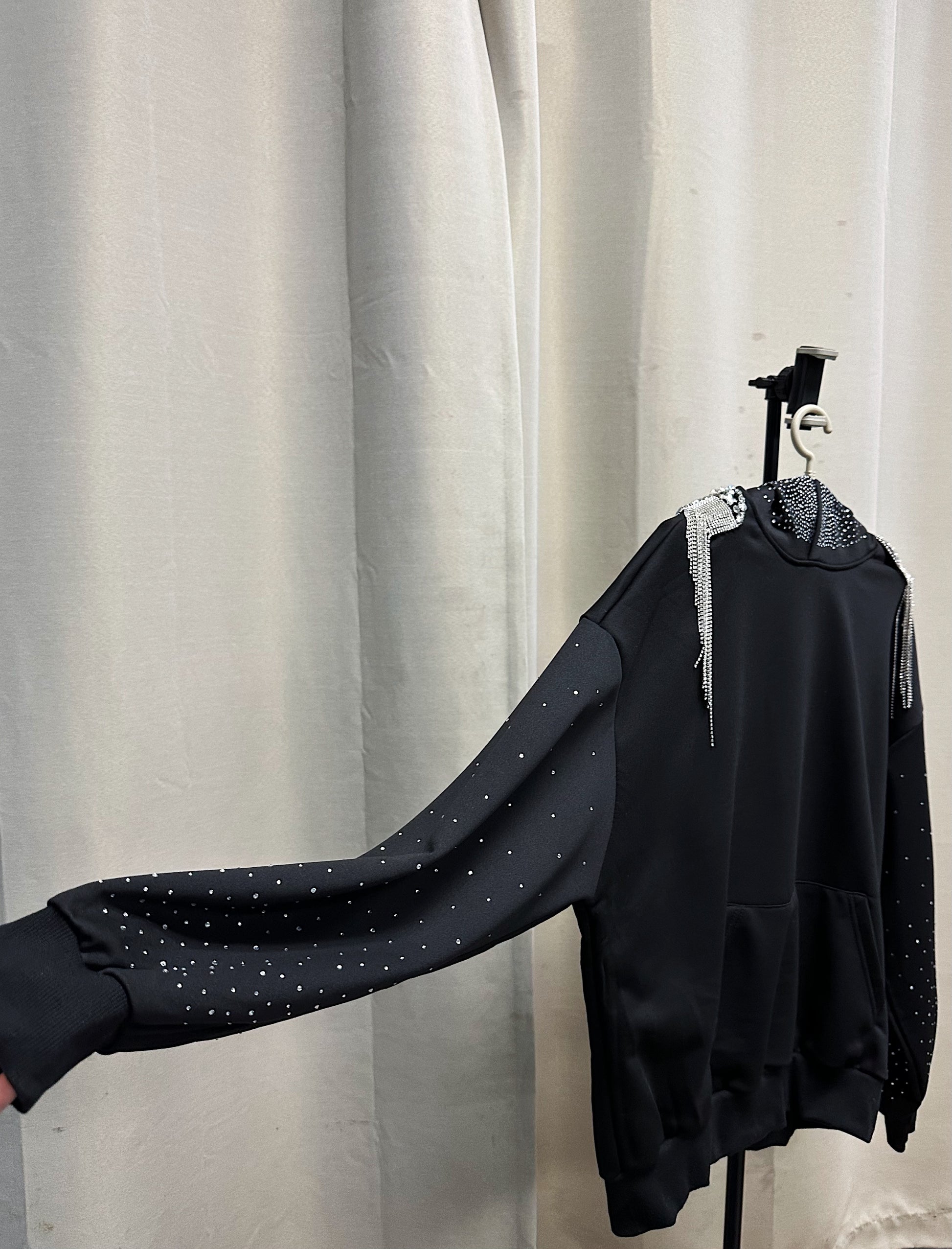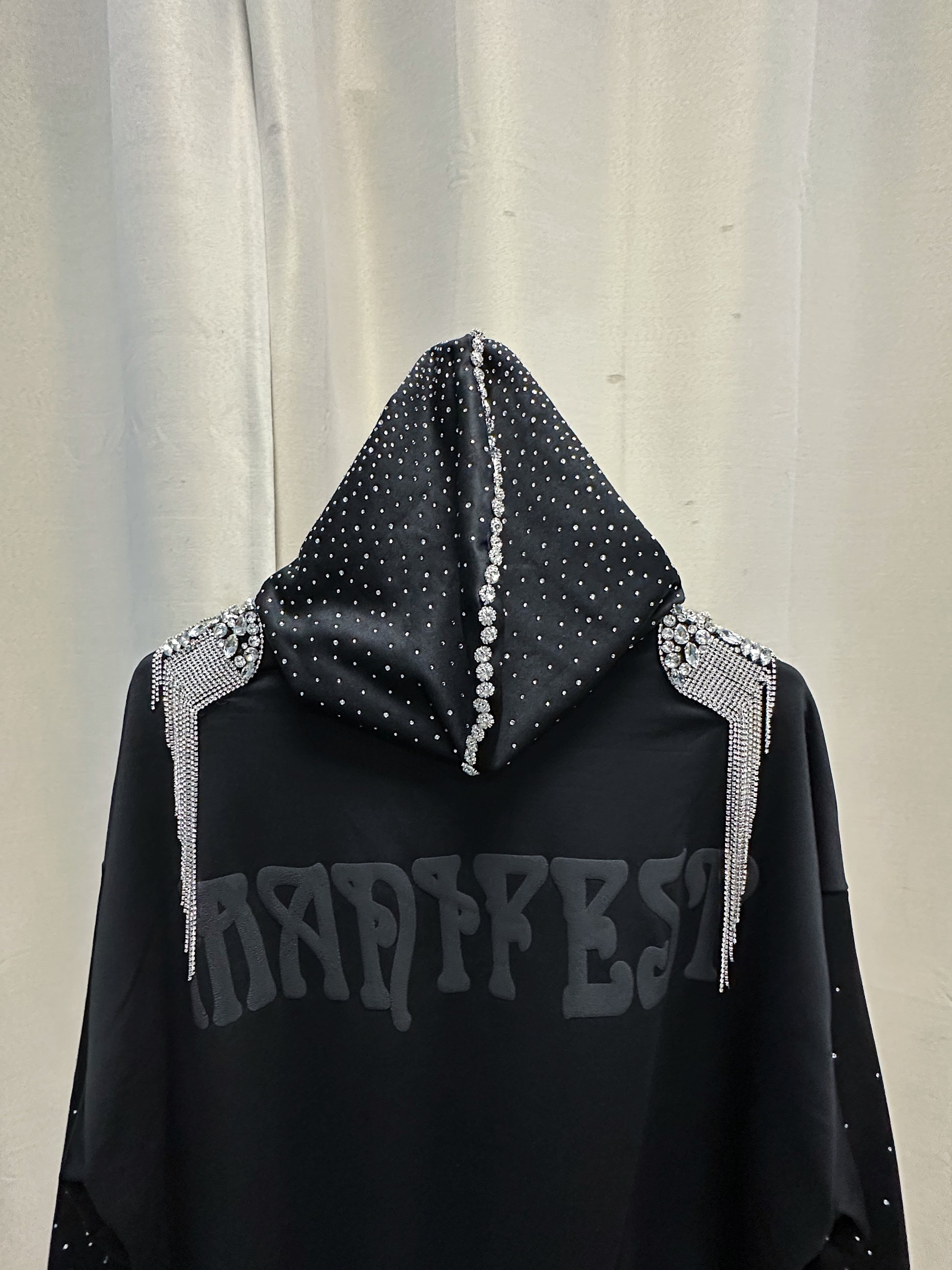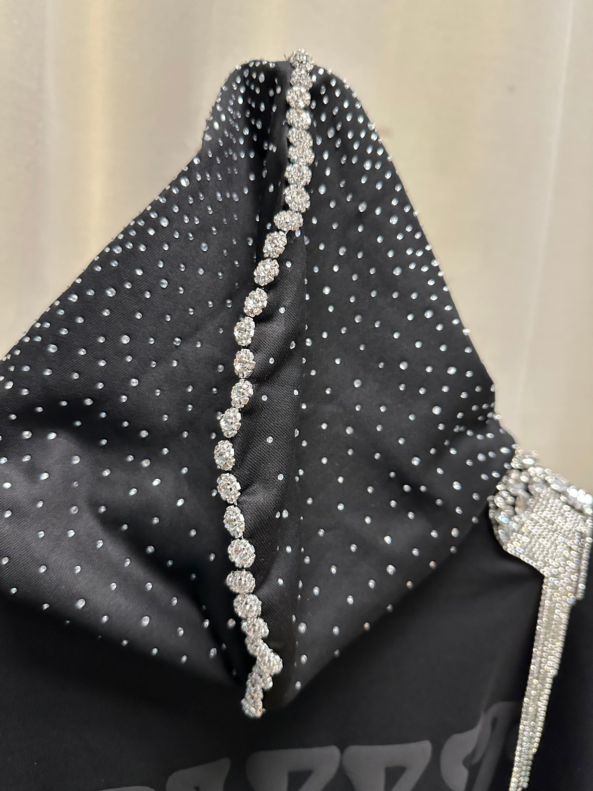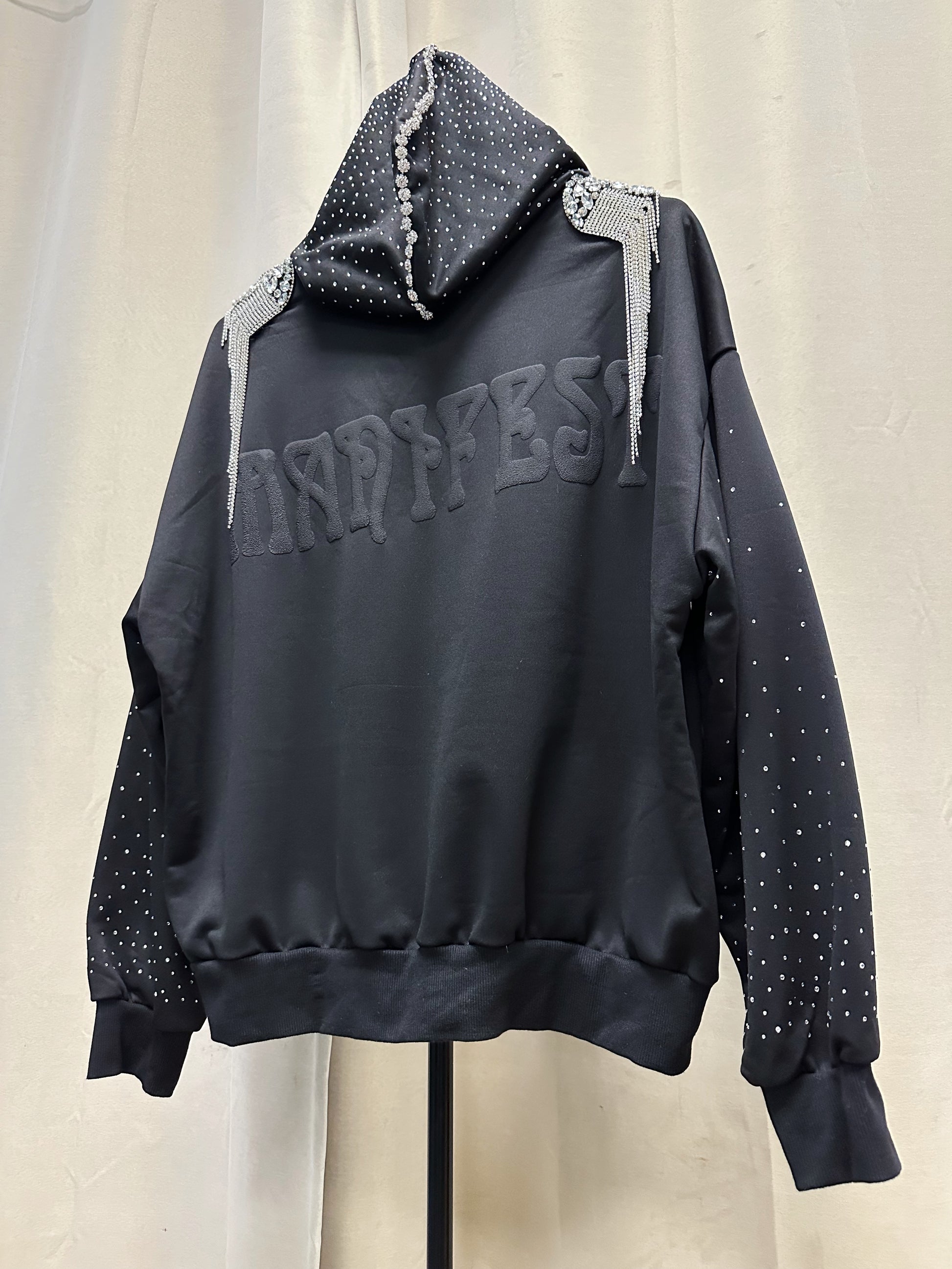 Built from a heavyweight black base, this one-of-one piece merges streetwear ease with couture embellishment. Crystal-studded sleeves arc with subtle shimmer, while the hood is fully encrusted in hand-placed rhinestones that form a constellation-like gradient.