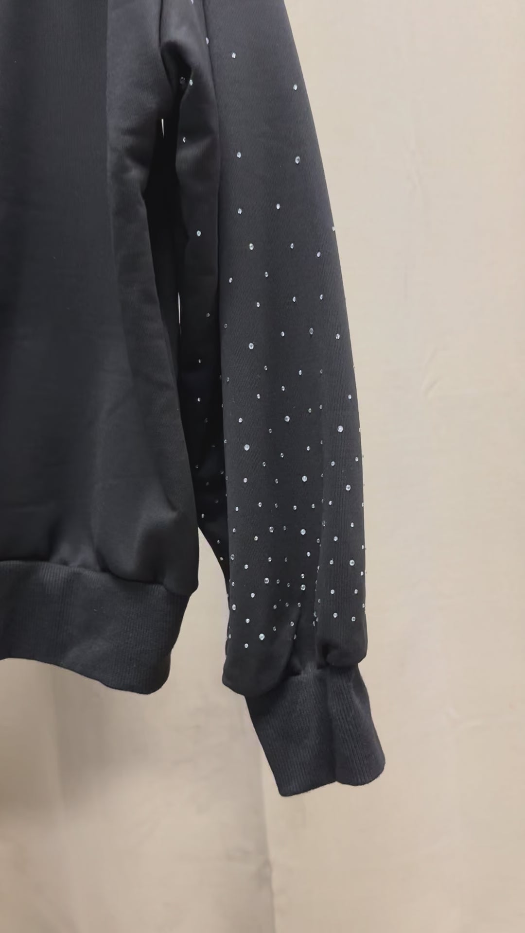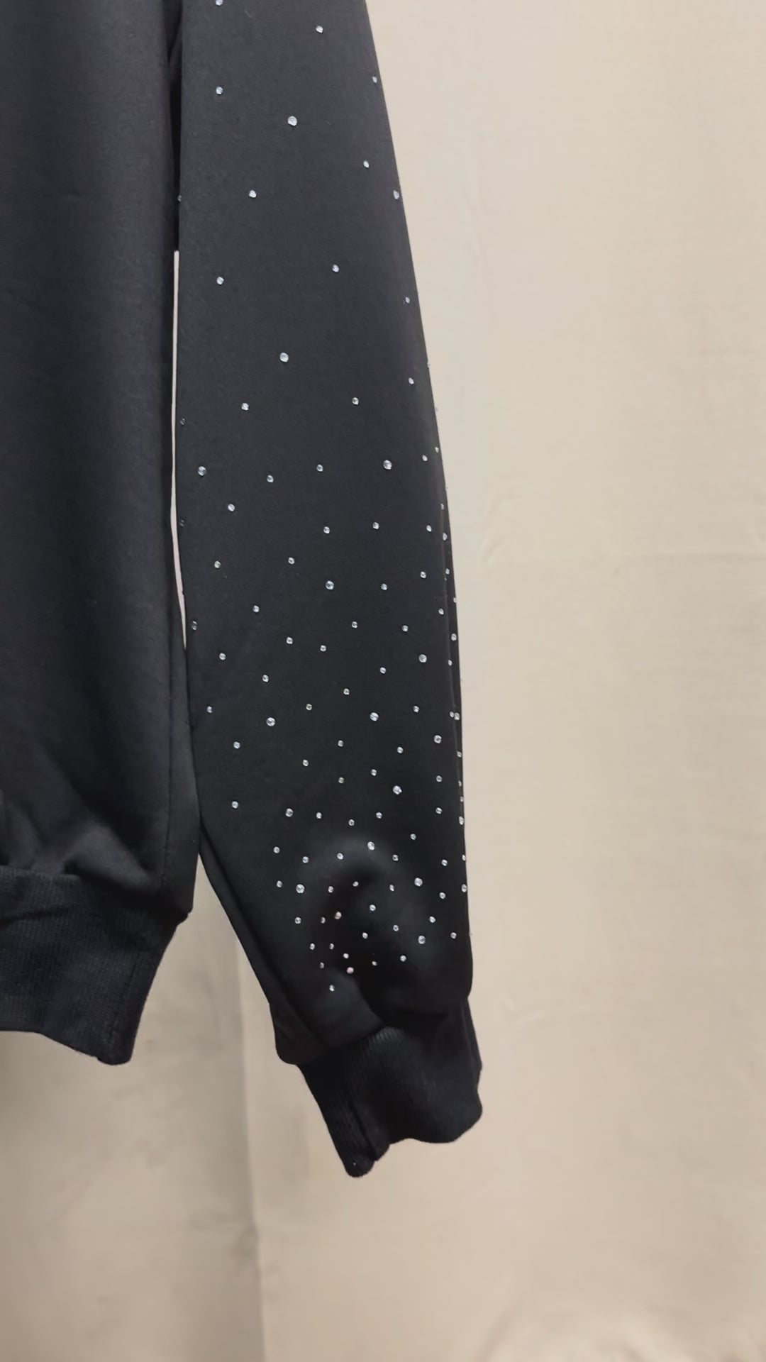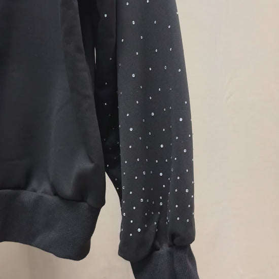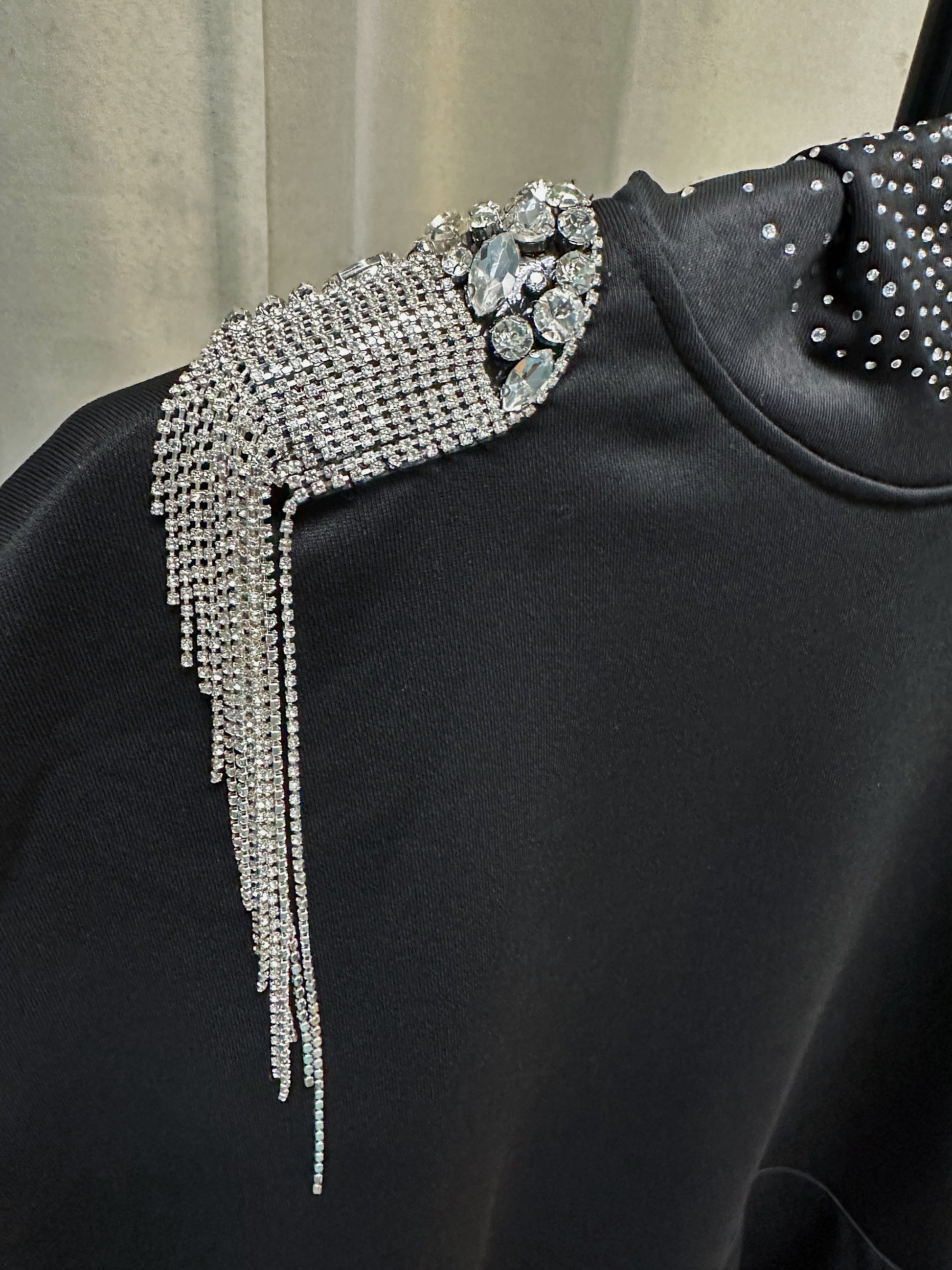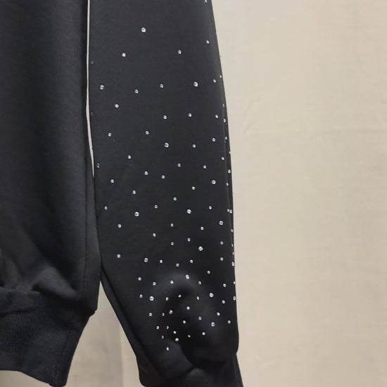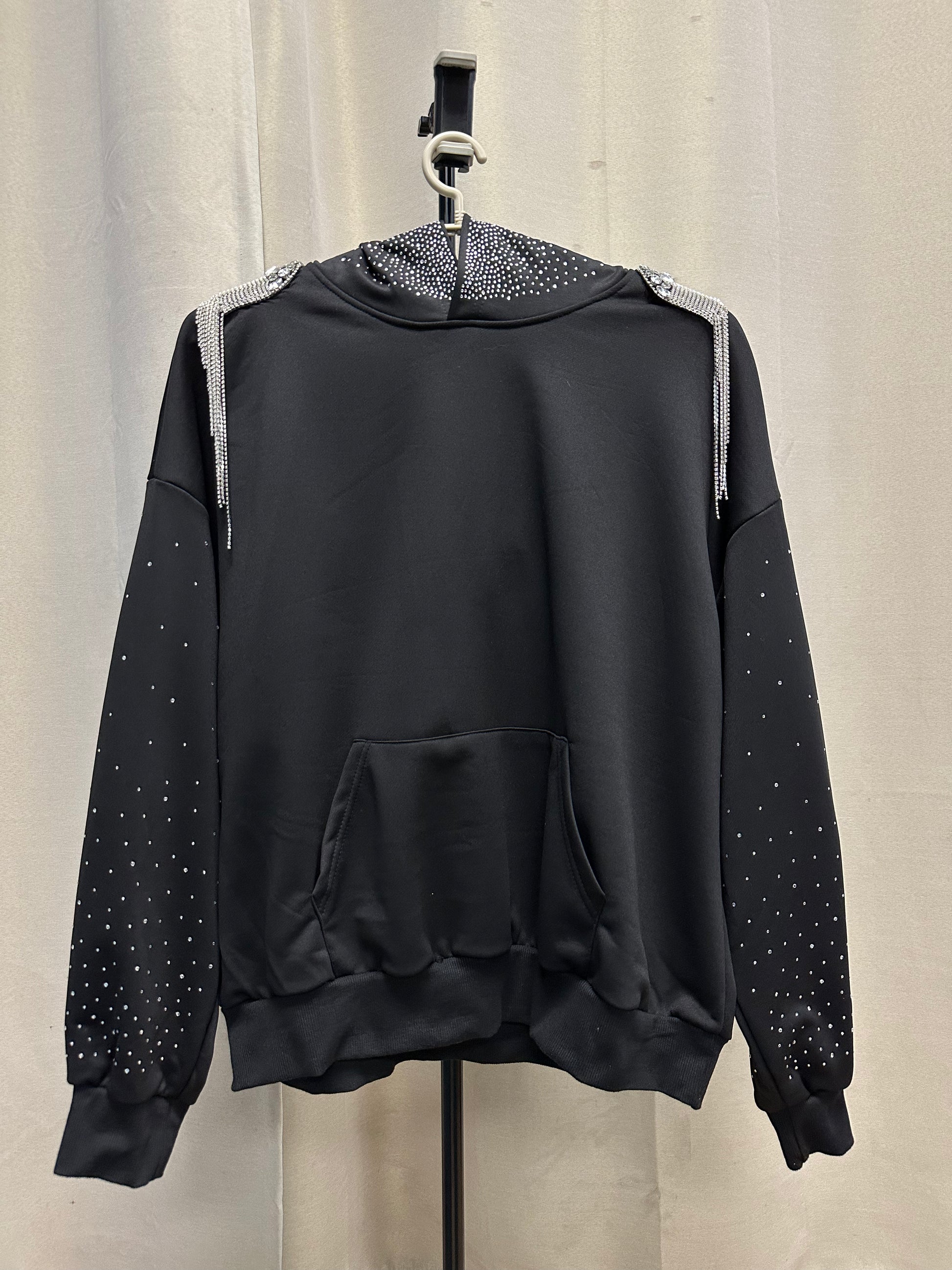 Built from a heavyweight black base, this one-of-one piece merges streetwear ease with couture embellishment. Crystal-studded sleeves arc with subtle shimmer, while the hood is fully encrusted in hand-placed rhinestones that form a constellation-like gradient.