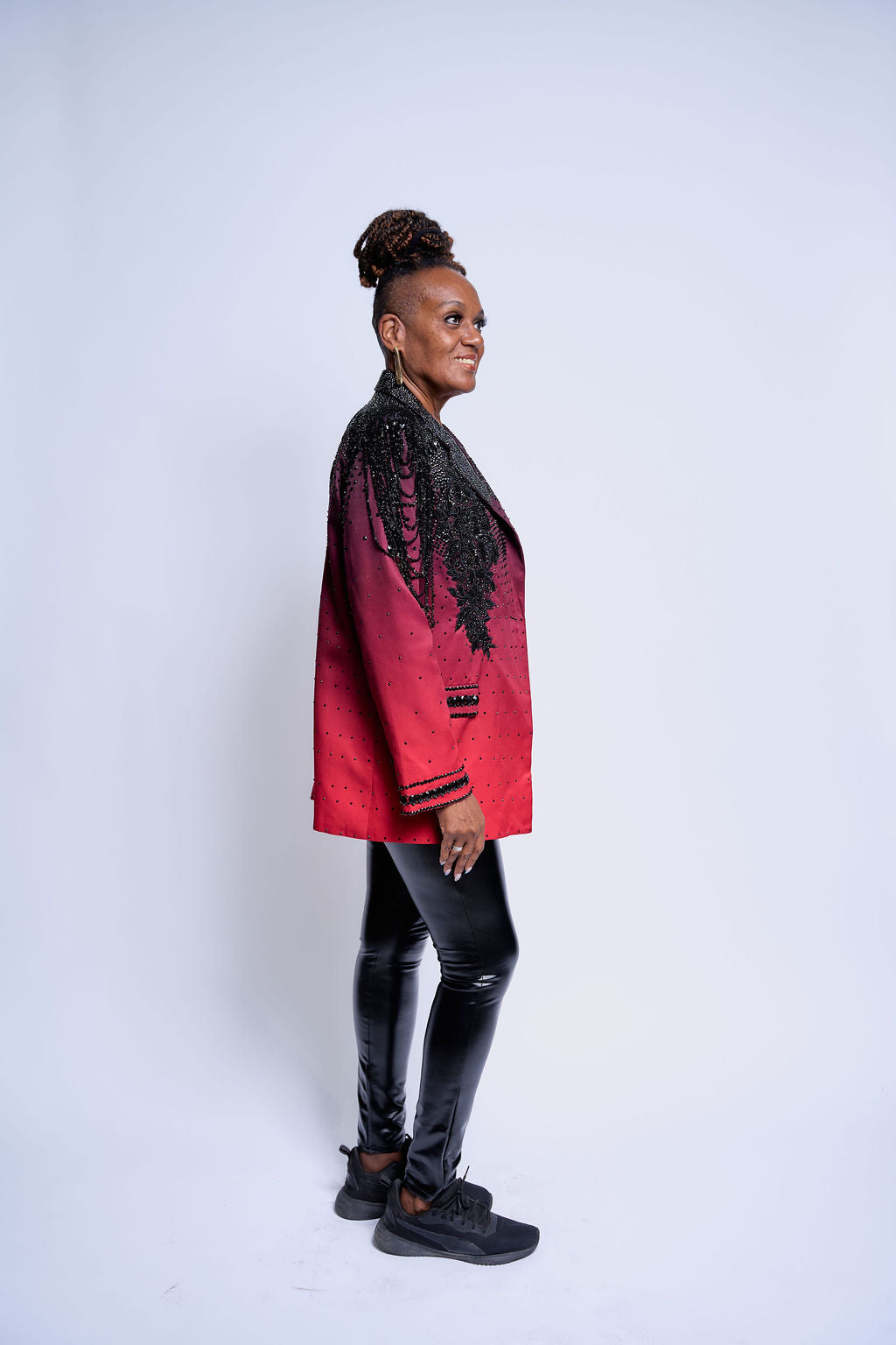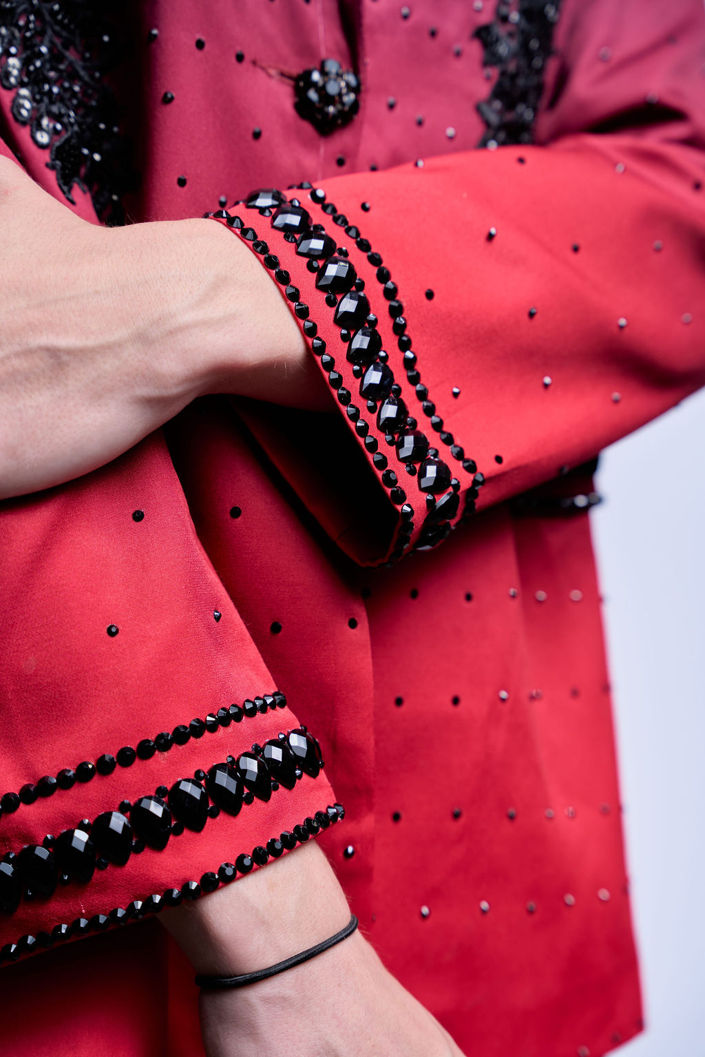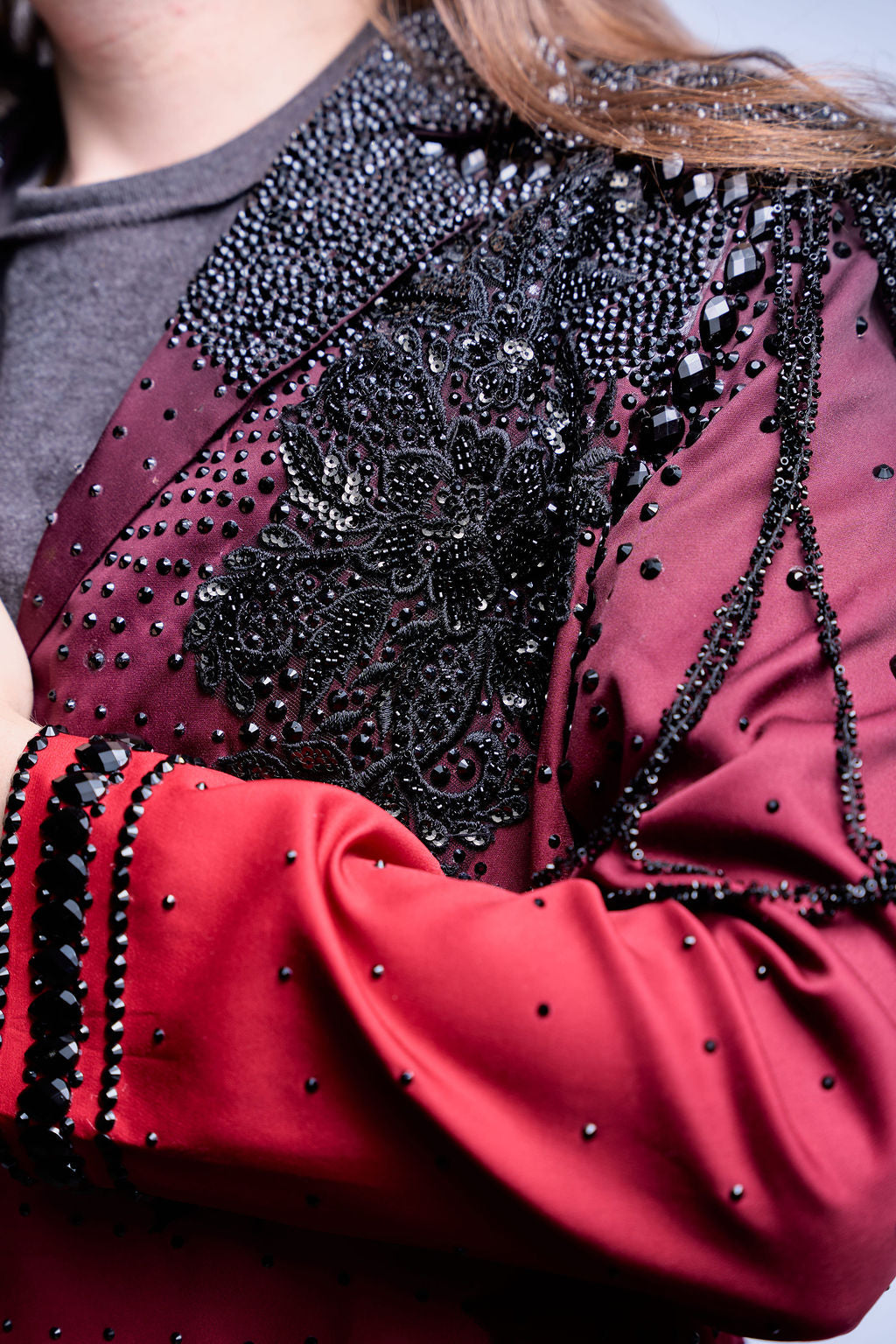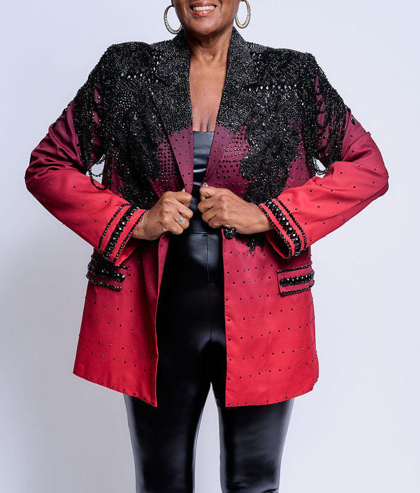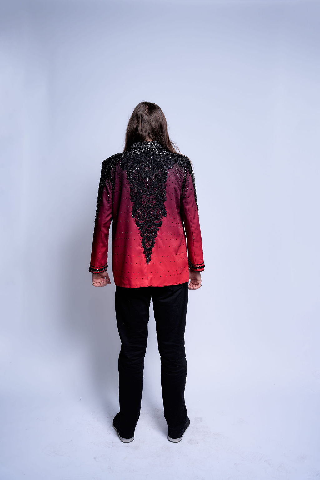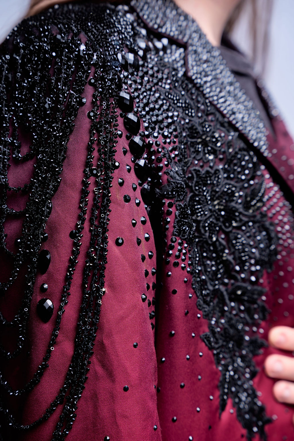 A deep merlot base burns gradually into crimson, setting the field for sculptural lace appliqué and individually-placed beadwork.