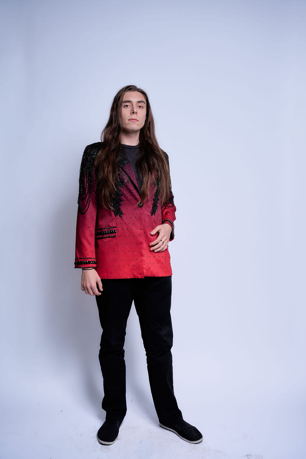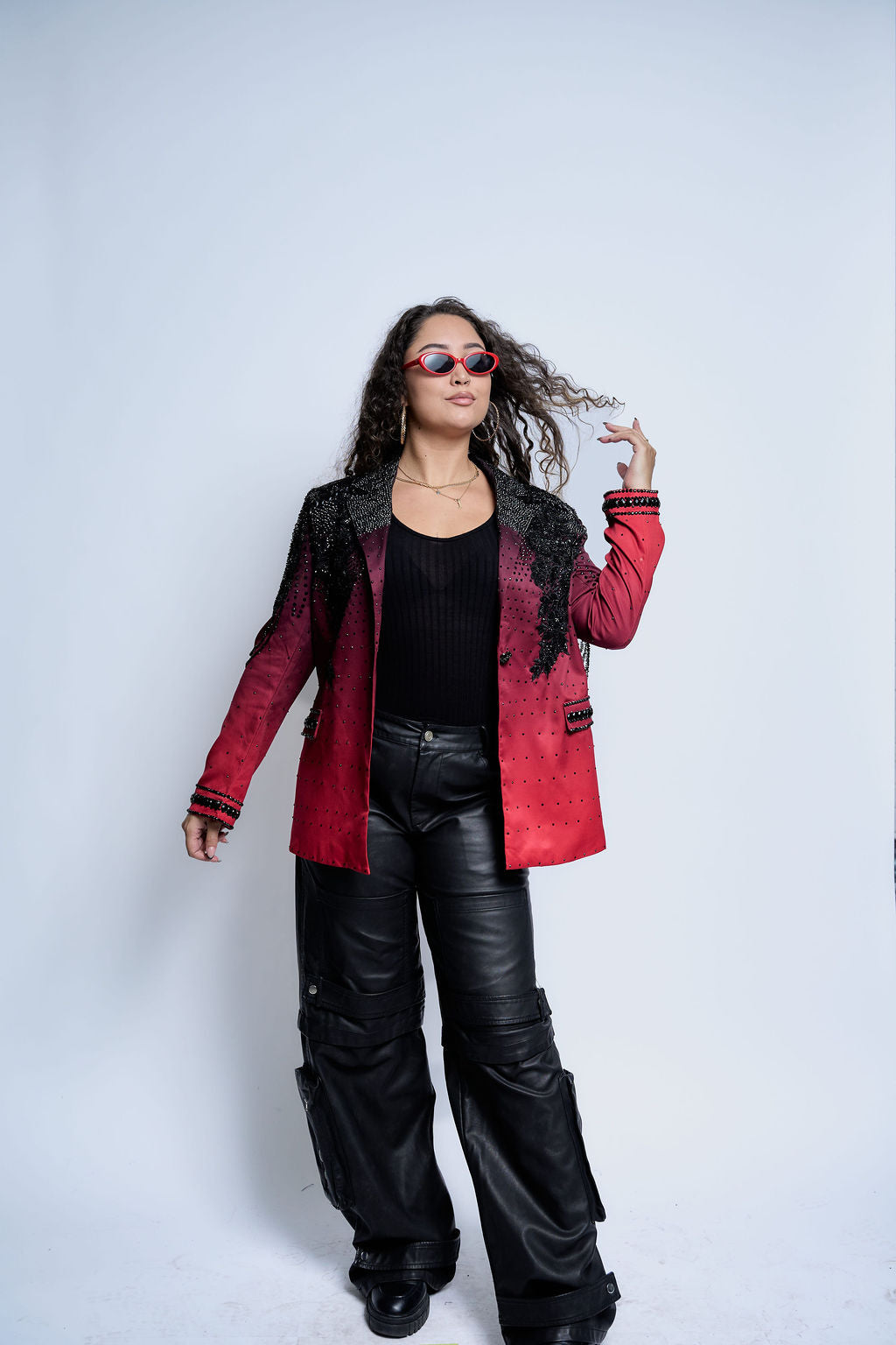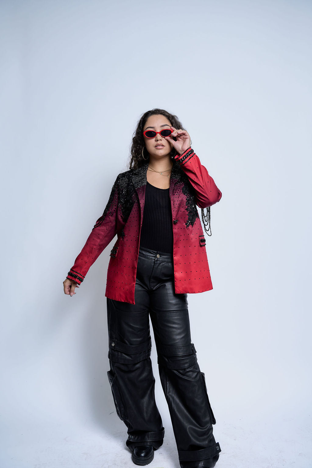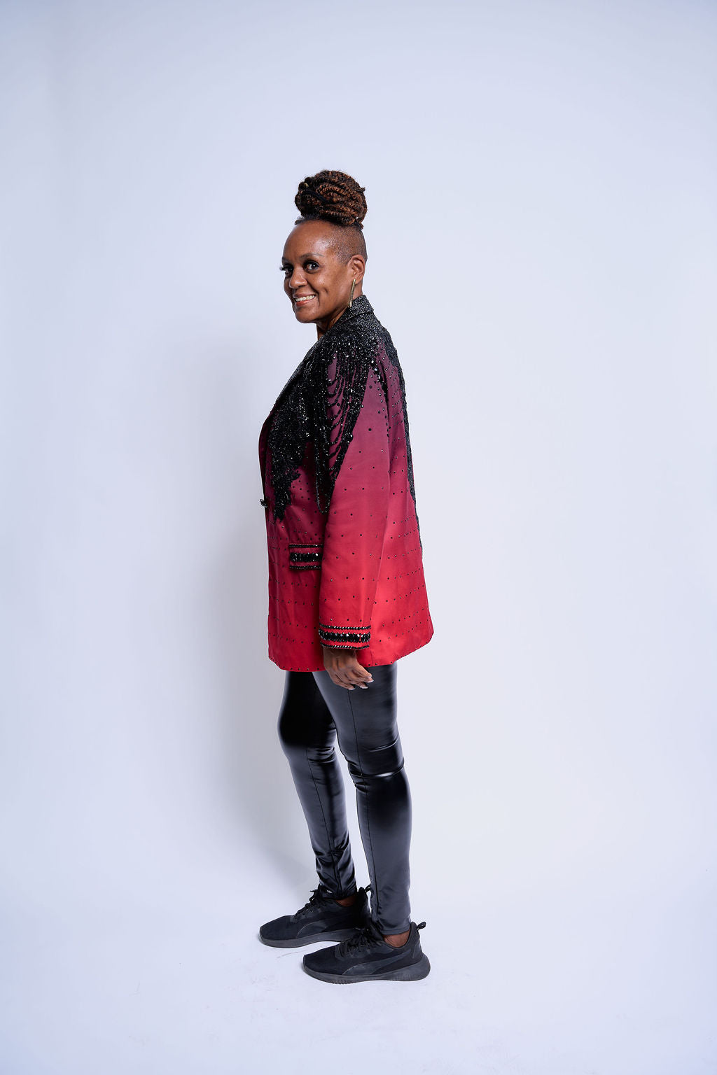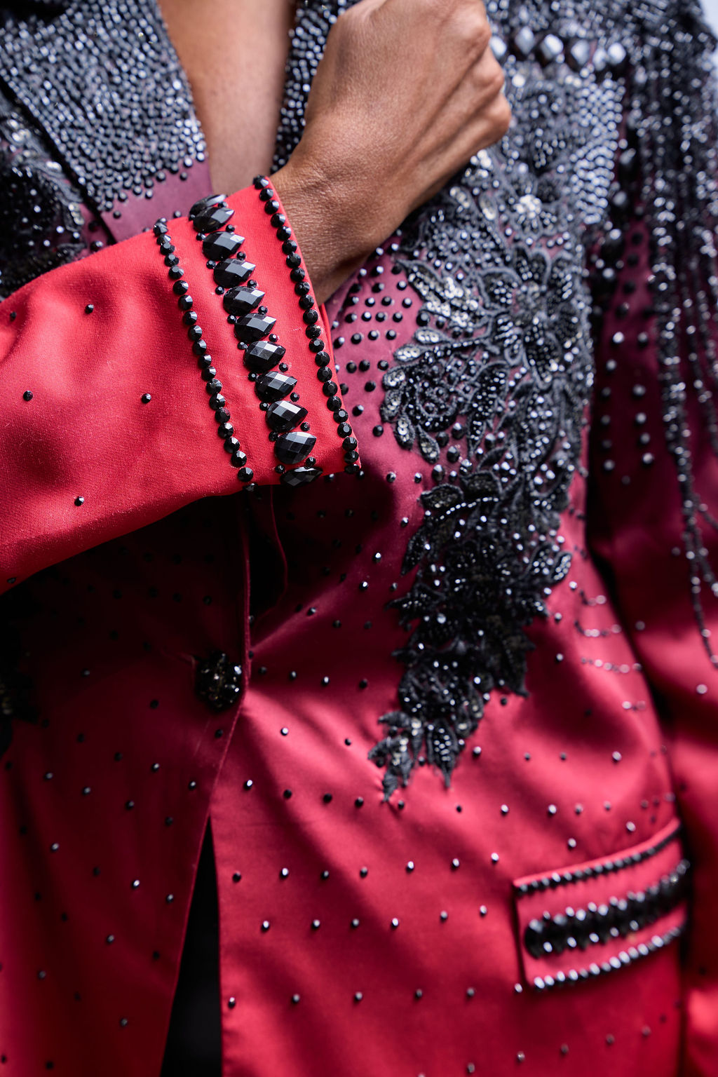 A deep merlot base burns gradually into crimson, setting the field for sculptural lace appliqué and individually-placed beadwork.