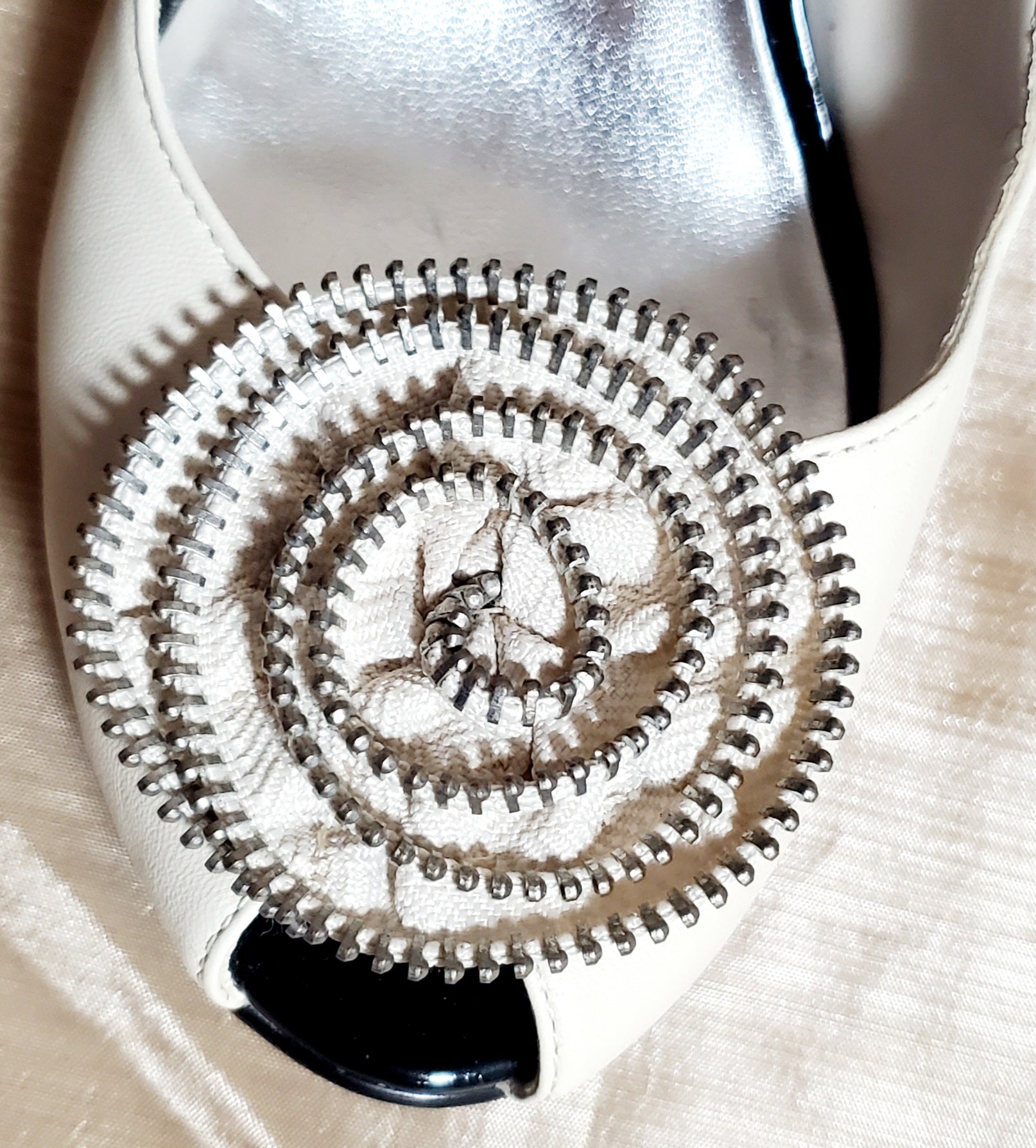 - Gently used vintage white open-toe leather pump with zipper flower details